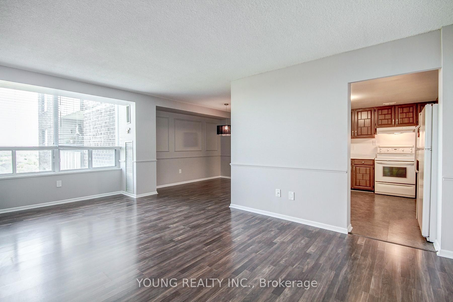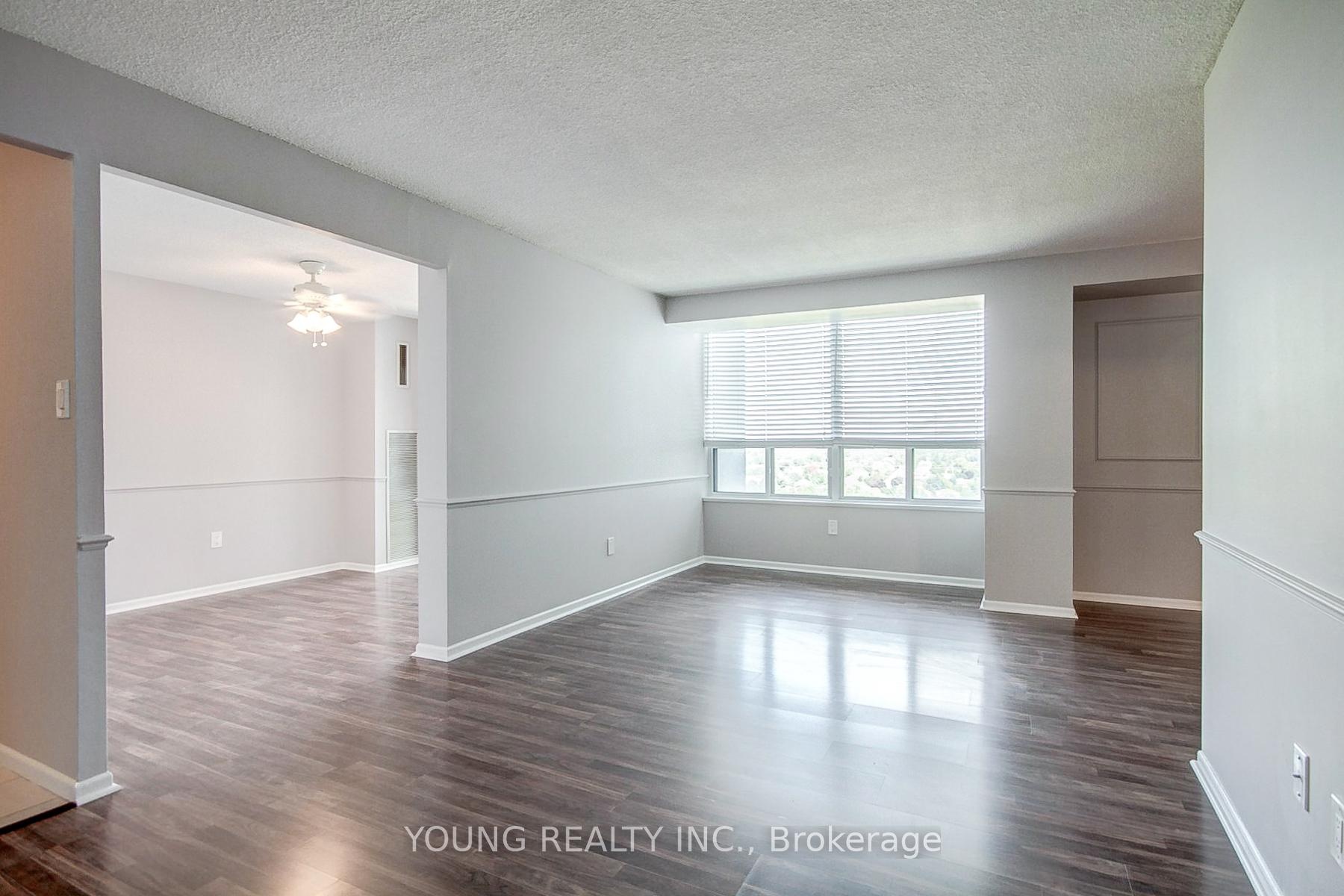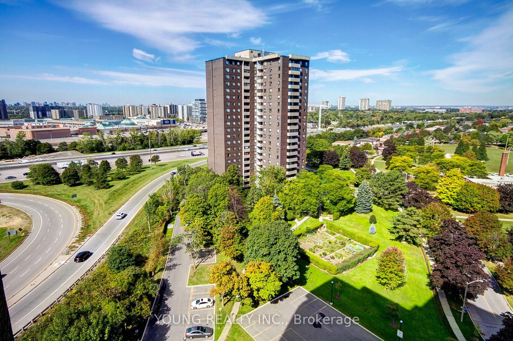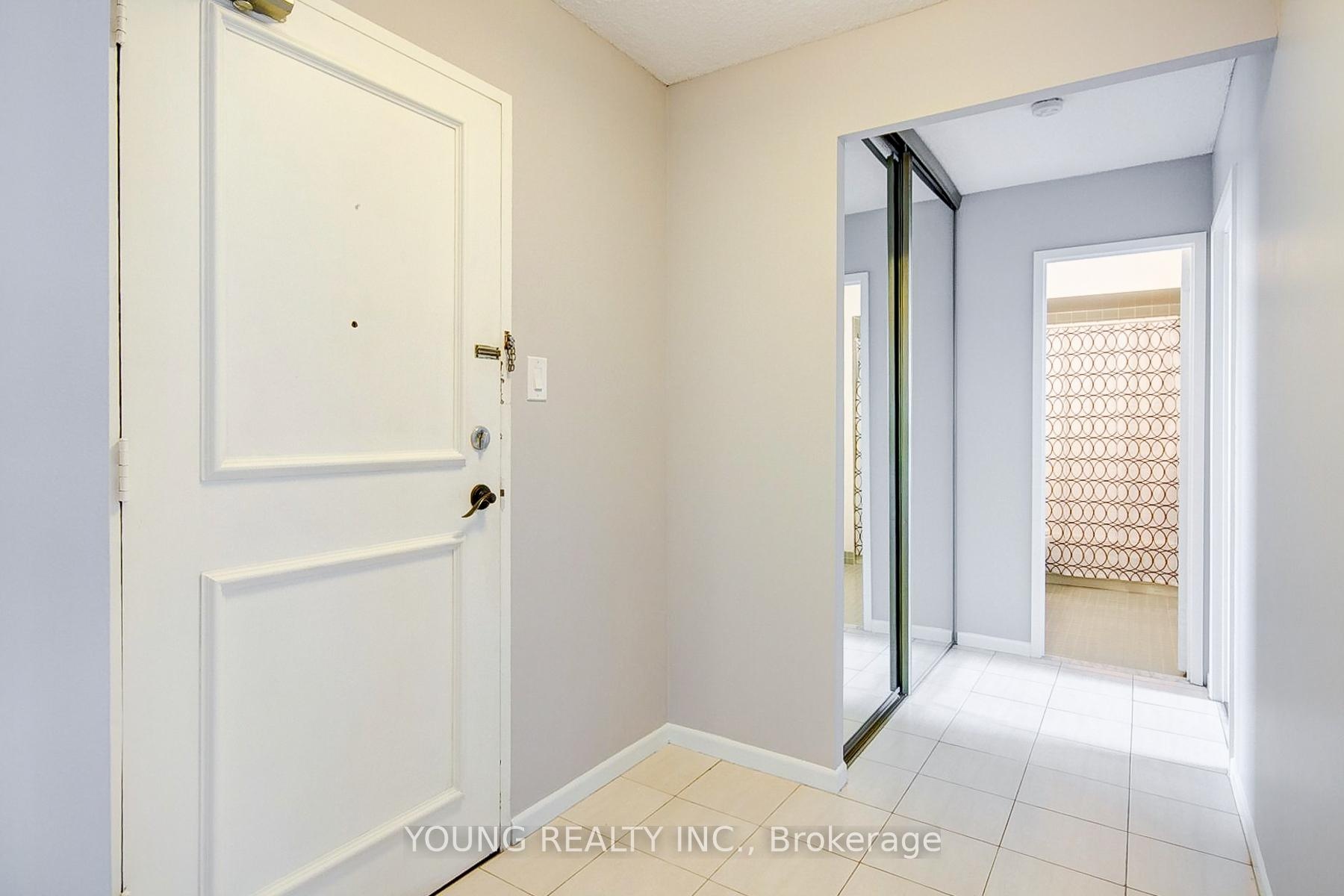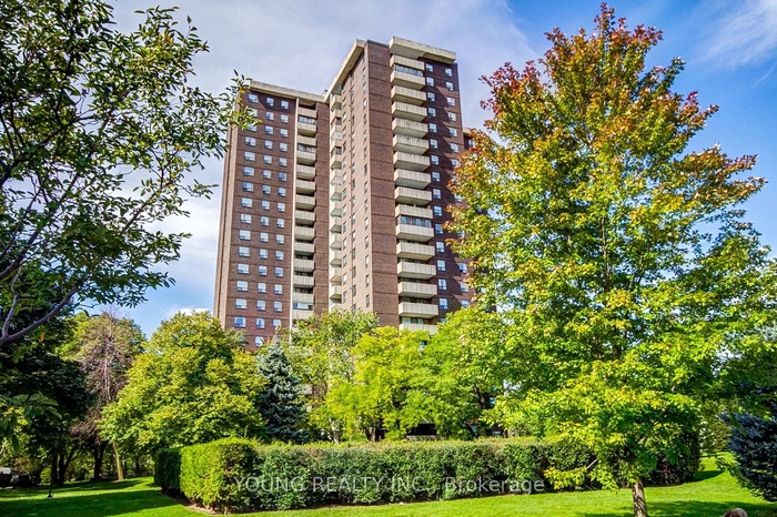 Spacious and bright suite in a highly sought-after building surrounded by lush, park-like grounds. Enjoy expansive city and green views from this open-concept layout featuring newer laminate flooring throughout and generous storage space. Unbeatable location just steps to shopping, local transit, and the subway, with every amenity close at hand. Two indoor (tandem) parking spots and all utilities (except internet) included!