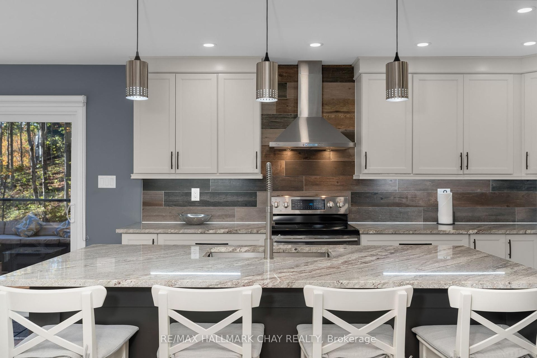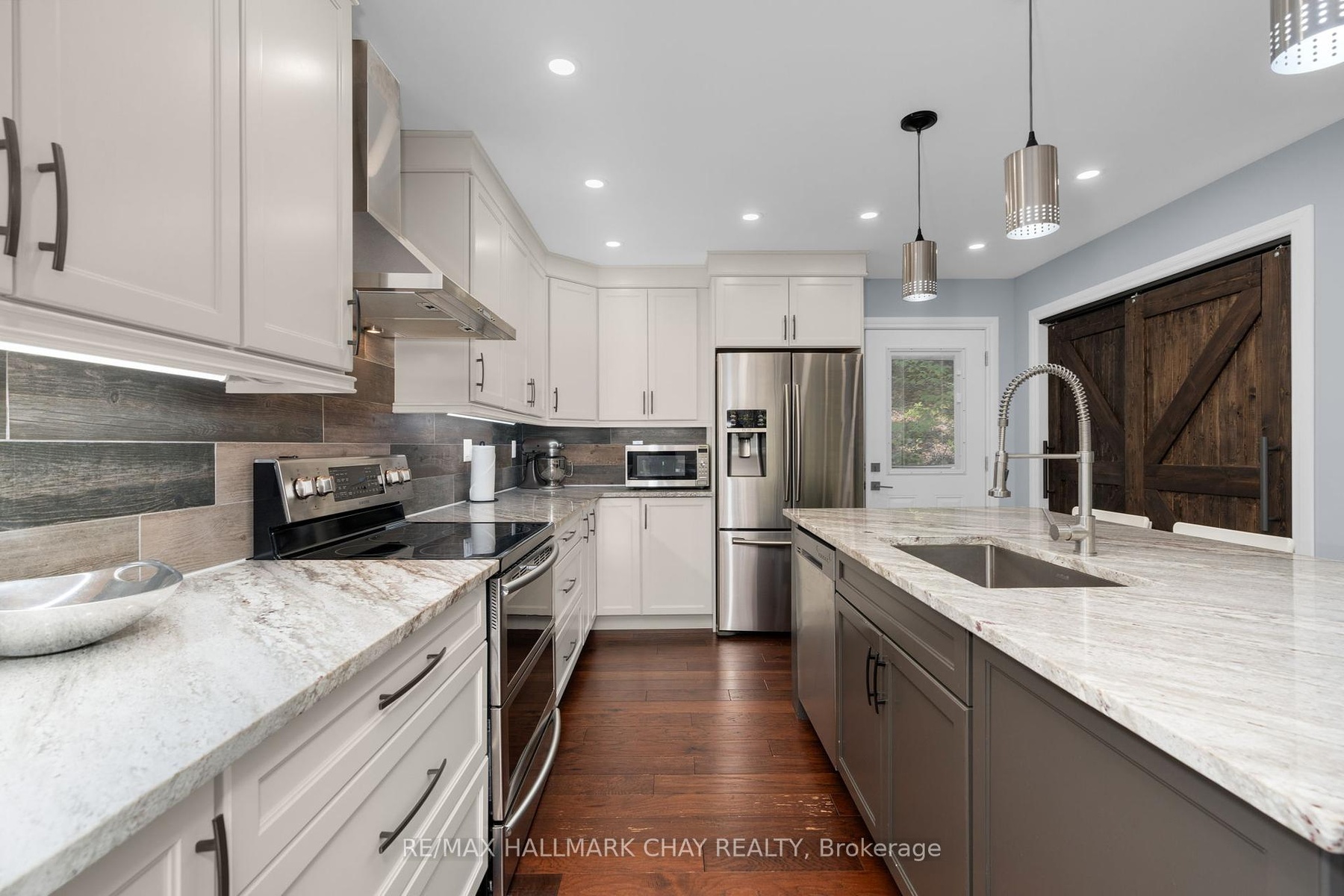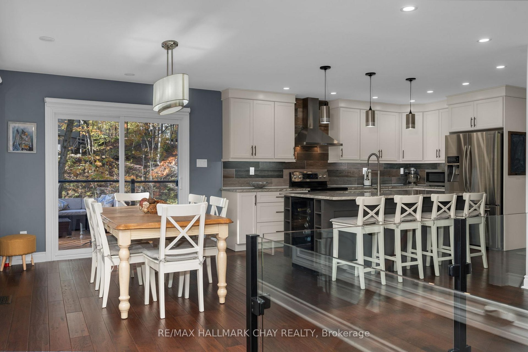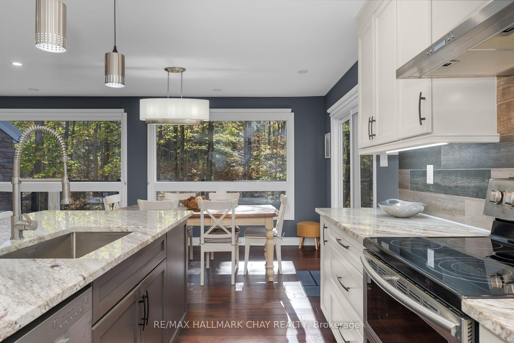 Welcome to the community of Sugarbush. This beautiful home is nestled in the woods. Completely updated and turn key with a flexible closing. Perfect home or chalet for that ski family. Gourmet kitchen with granite counter tops and stainless steel appliances. Built in wine fridge and wine rack in island. Pantry with barn doors and a walkout out to the lovely deck with glass railings. Dining area with sliding doors and big picture windows that bring in lots of light and a beautiful nature view. The primary bedroom offers a wall of built clothing storage. Two updated full bathrooms on each level. Upgraded electrical pot lights and dimmers on switches. The walk in ground level has a gas fireplace with stone surround and offers two more bedrooms. The Recreation room is welcoming and open with a gorgeous custom built staircase. This home will not disappoint and shows 10+. Sweet water park is located down the road. Walking and biking trails throughout the subdivision. In that catchment area for the new Horseshoe Heights elementary school in Horseshoe Valley. Shed for storage and lots of parking.