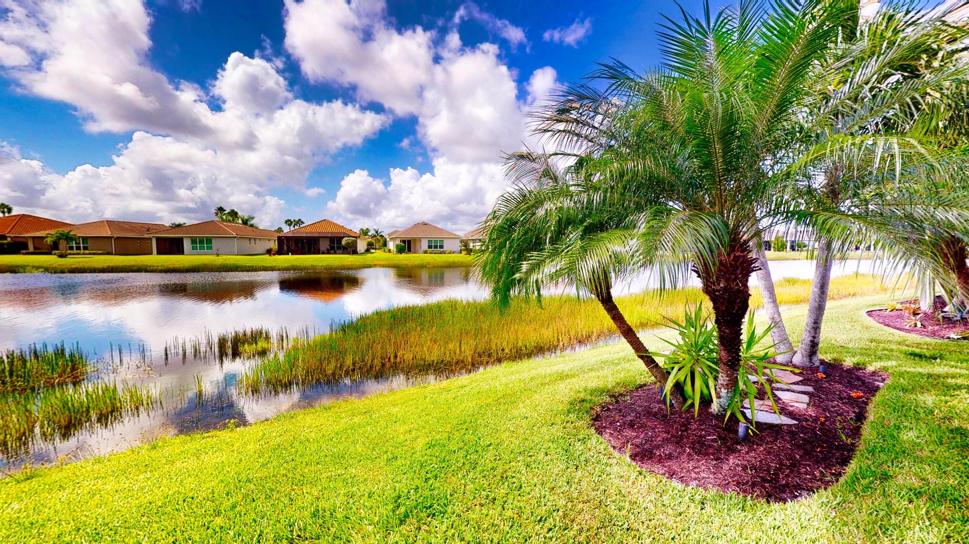 This beautifully appointed 2-bedroom, 2-bath home with a den offers over 2100 sq. ft. of luxurious living space and impeccable design throughout. The open floor plan features a spacious great room that flows seamlessly into the dining area and gourmet kitchen, complete with quartz countertops, 42-inch cabinets, and an upgraded gas range. Unique double glass French doors lead to an extended, covered lanai where you can enjoy stunning lake views and lush, upgraded landscaping, the perfect setting for entertaining or quiet relaxation. The home showcases elegant details such as crown molding, custom cabinetry, a barrel tile roof, and impact windows for peace of mind. The den includes built-in dual desks and cabinets, ideal for a home office or creative space.