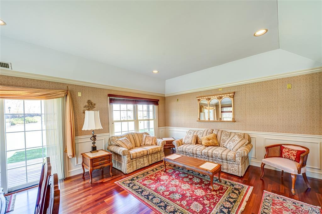 - Living area with wallpapered walls, a wainscoted wall, healthy amount of natural light, wood finished floors, and recessed lighting