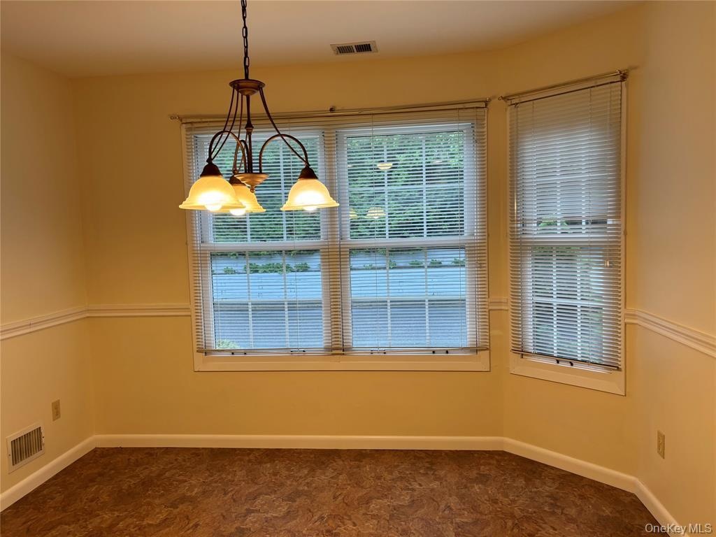 - Unfurnished dining area with plenty of natural light and a chandelier