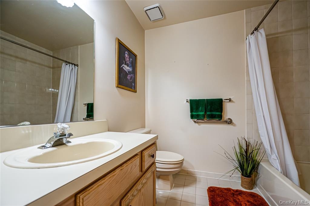 - Bathroom with light tile patterned flooring, shower / bath combo, and vanity