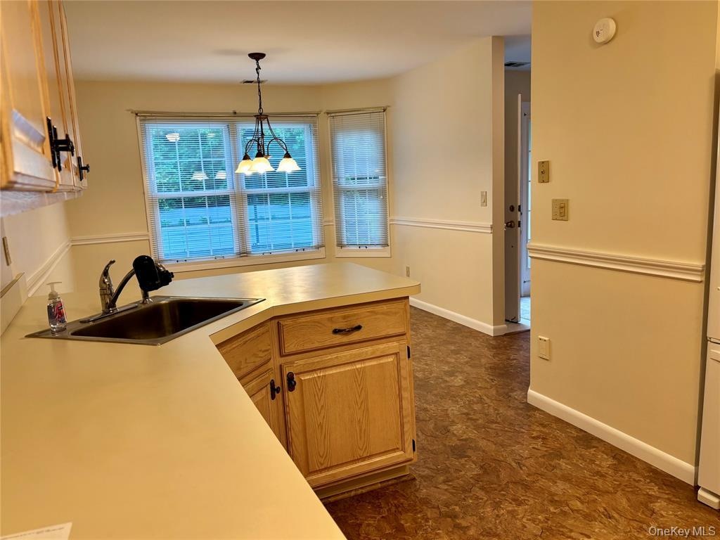 - Kitchen with light countertops, decorative light fixtures, a chandelier, and a peninsula