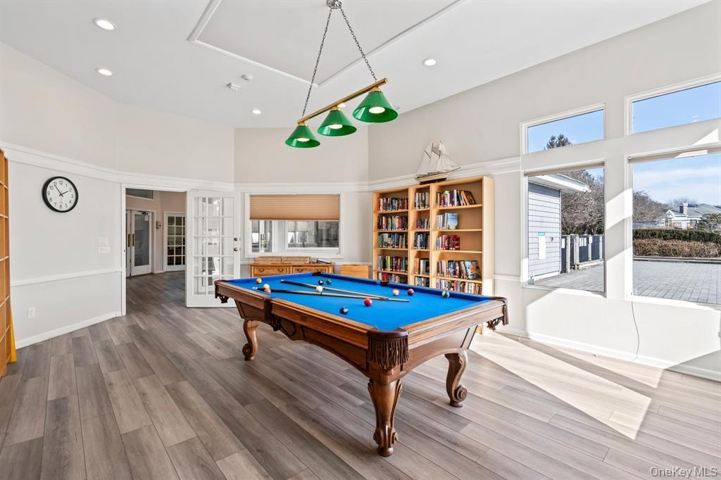 - Game room featuring billiards table, a high ceiling, wood finished floors, french doors, and recessed lighting