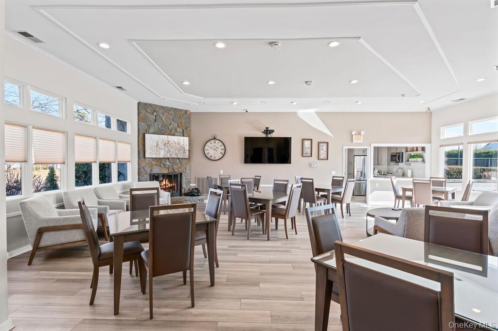 - Dining room featuring a fireplace, light wood-type flooring, recessed lighting, and a tray ceiling