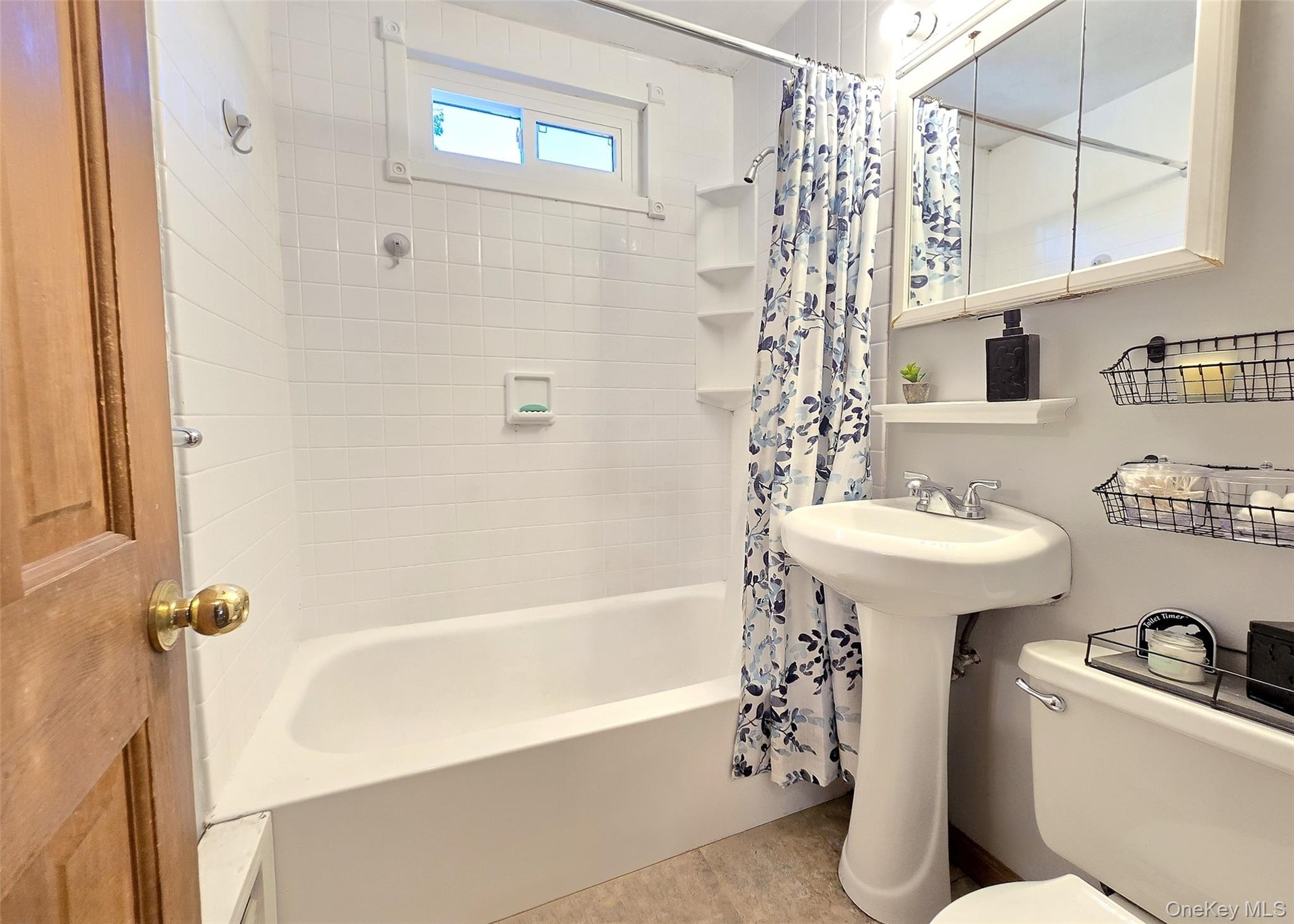 - Full bath with shower / bathtub combination with curtain and light tile patterned floors