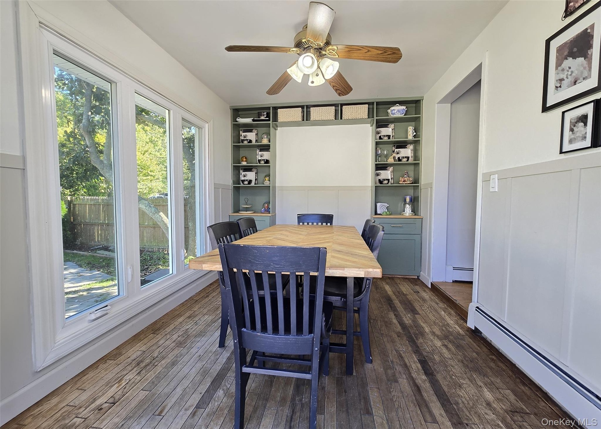 - Dining room featuring a baseboard heating unit, built in features, dark wood-type flooring, and a ceiling fan