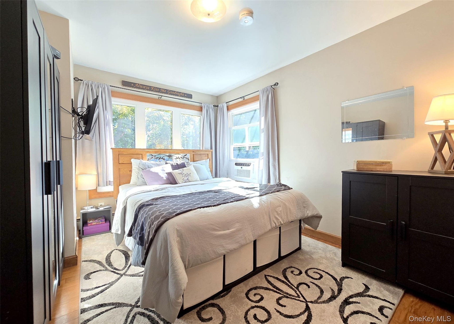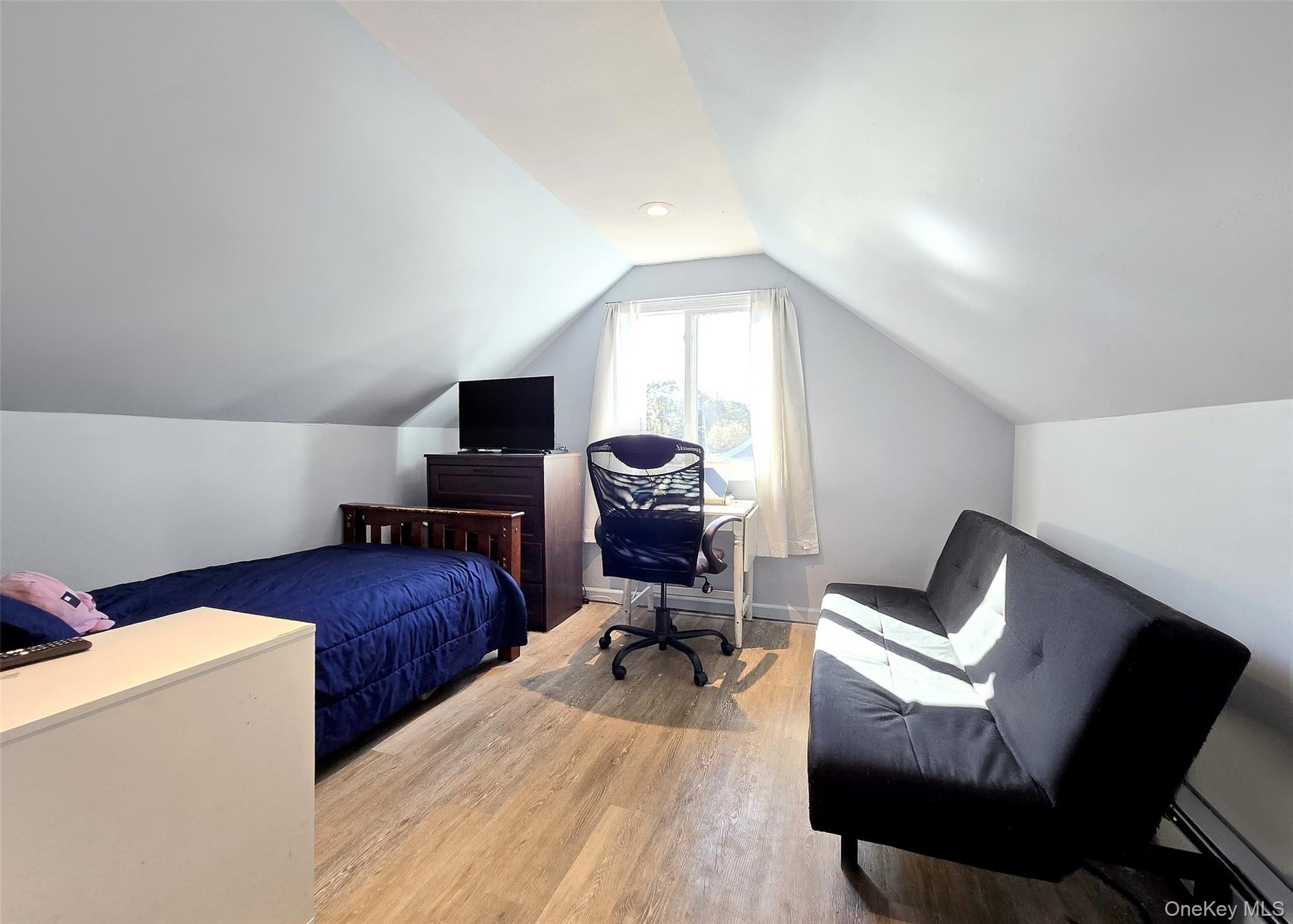 - Bedroom featuring light wood-style flooring, lofted ceiling, and a baseboard heating unit