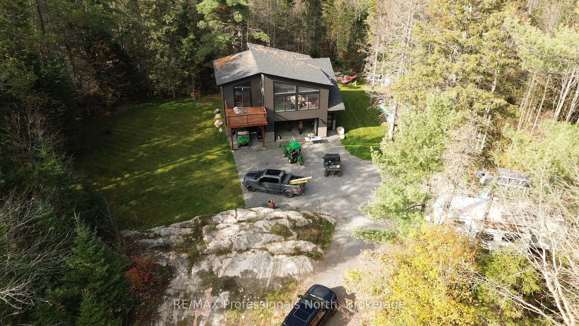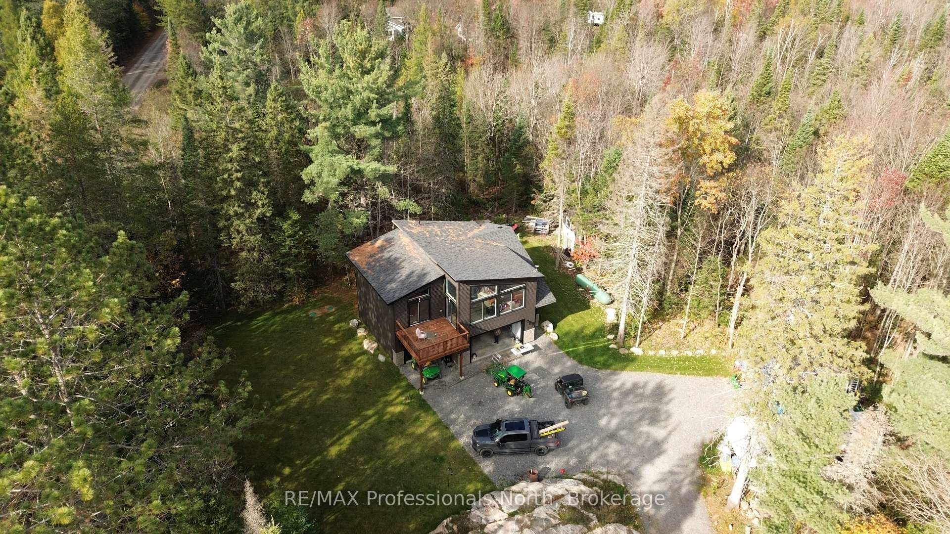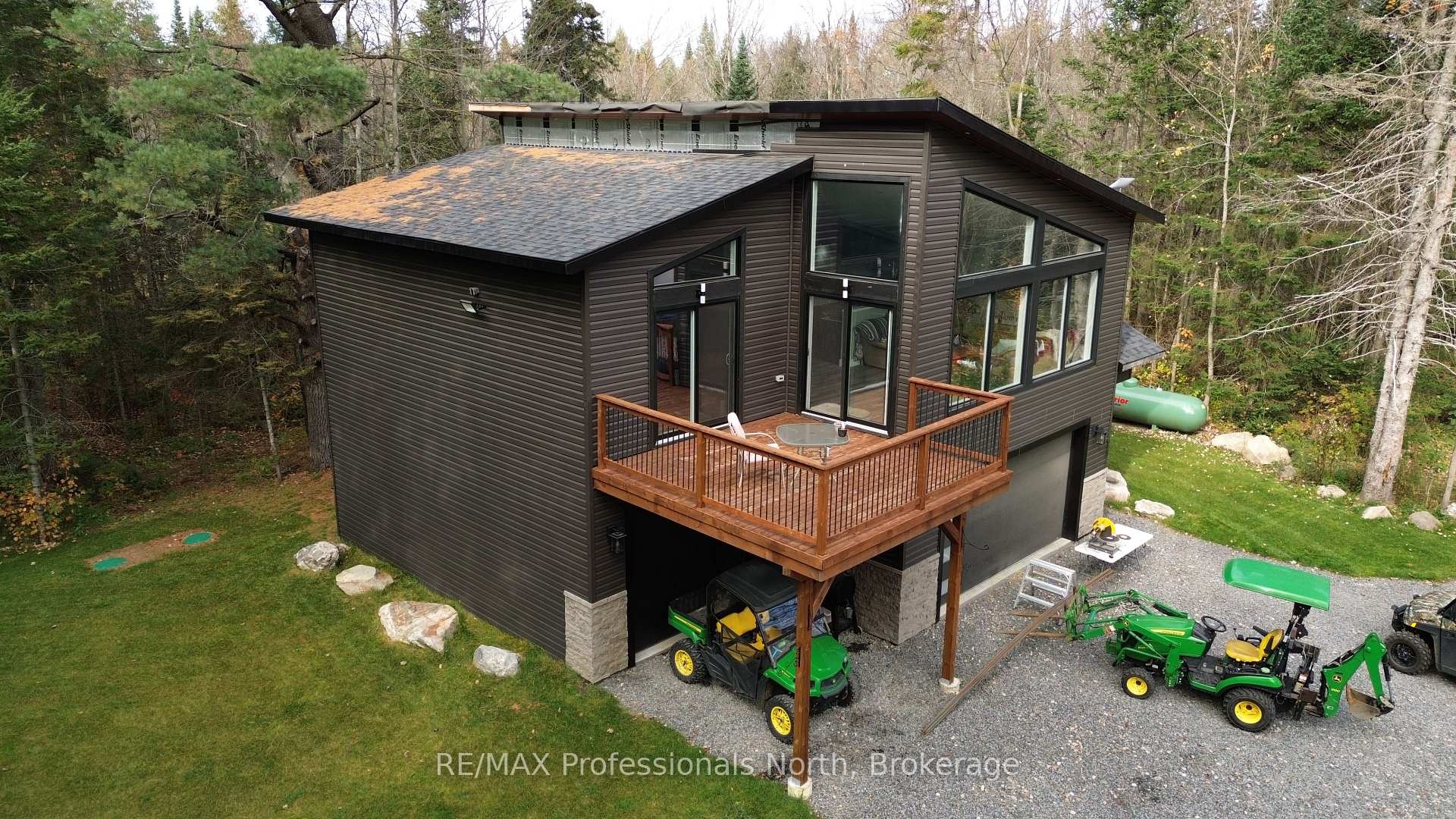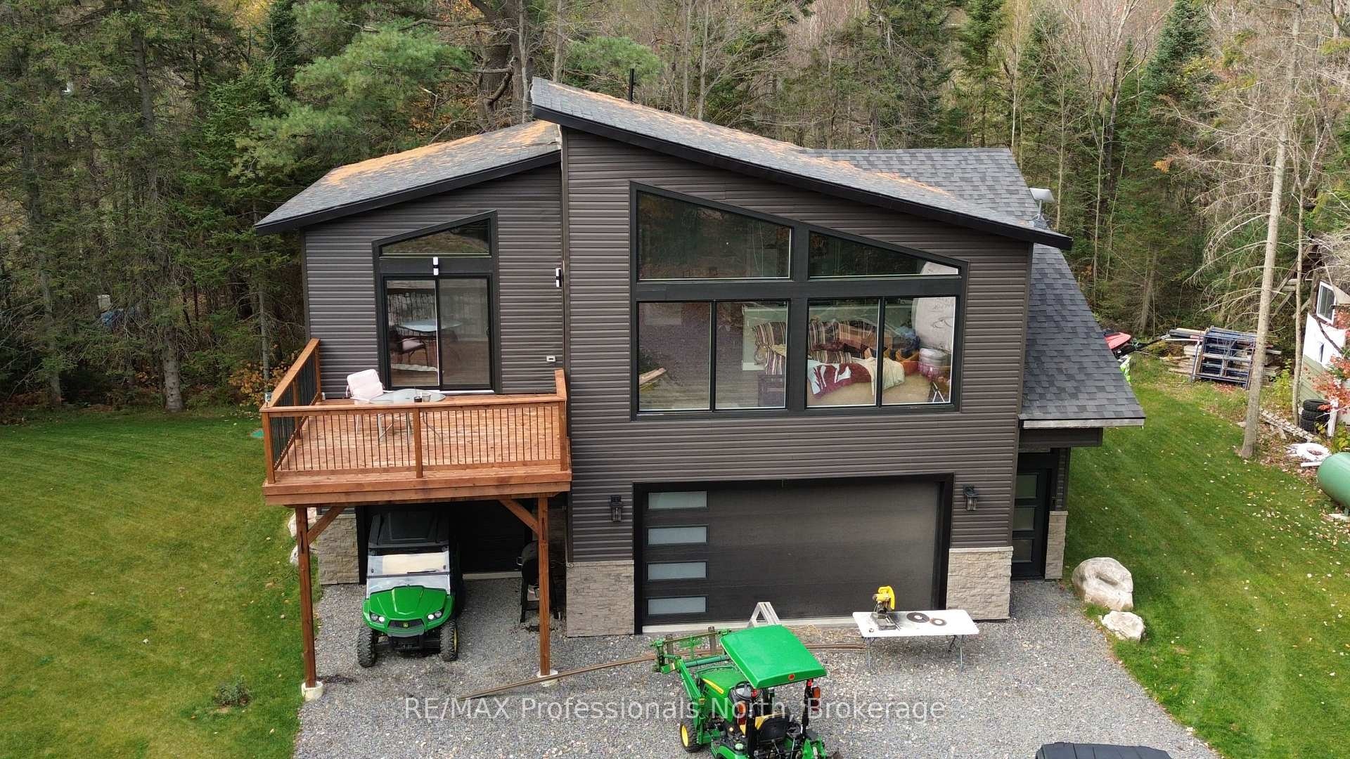 Built in 2023, this beautifully crafted home blends contemporary design with the peaceful charm of a forest setting. Nestled among the trees on a private one-acre lot, it offers the perfect balance of comfort, style, and practicality just 30 minutes from Huntsville. Step inside to an inviting open-concept living space featuring soaring cathedral ceilings, energy-efficient pot lighting, and large windows that frame tranquil views of nature. The kitchen is a chefs dream, equipped with a professional Wolf range and generous counter space for entertaining or everyday cooking. With two spacious bedrooms and two full bathrooms, each with its own large walk-in shower, the layout combines functionality with luxury. An extra-wide staircase easily accommodates a chair-lift, ensuring accessibility for all. The home's thoughtful features continue with a huge three-car garage, complete with in-floor heating, battery-backup garage door openers that can be operated remotely, and a full Generac generator for peace of mind. The main living level is warmed by efficient forced-air heating and air conditioning can be easily added for year-round comfort. Enjoy morning coffee or evening sunsets from the expansive decks at both the front and rear, surrounded by the quiet beauty of the forest. If you've been searching for a modern, energy-smart home with privacy, practicality, and just the right touch of luxury - this one checks every box.