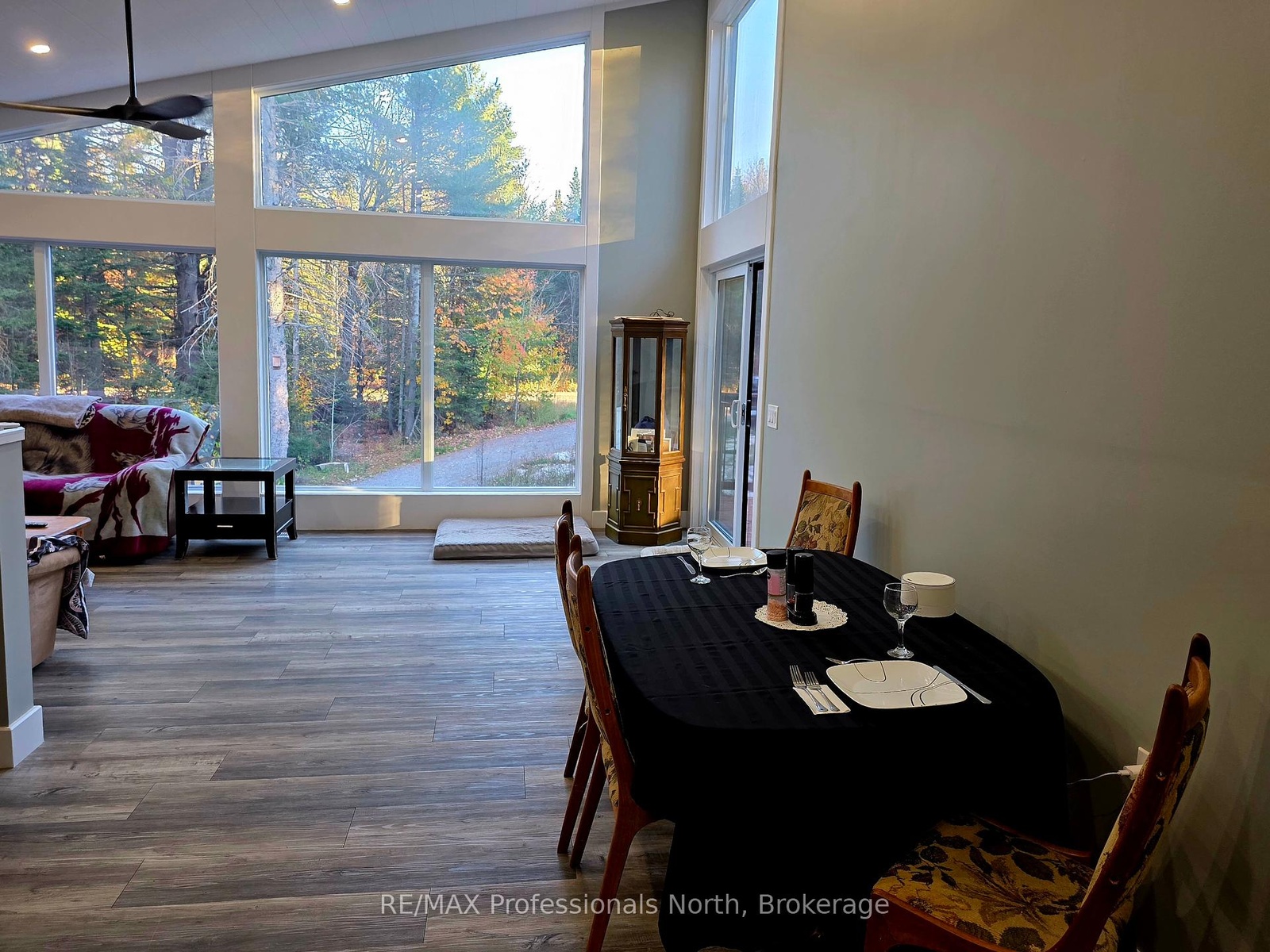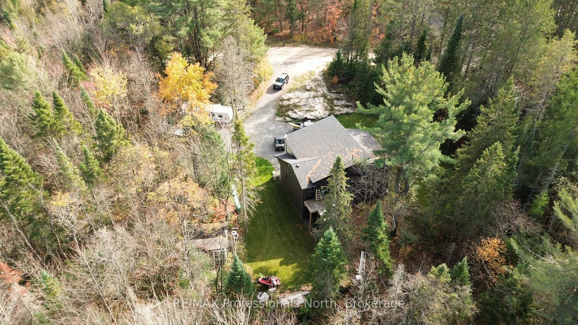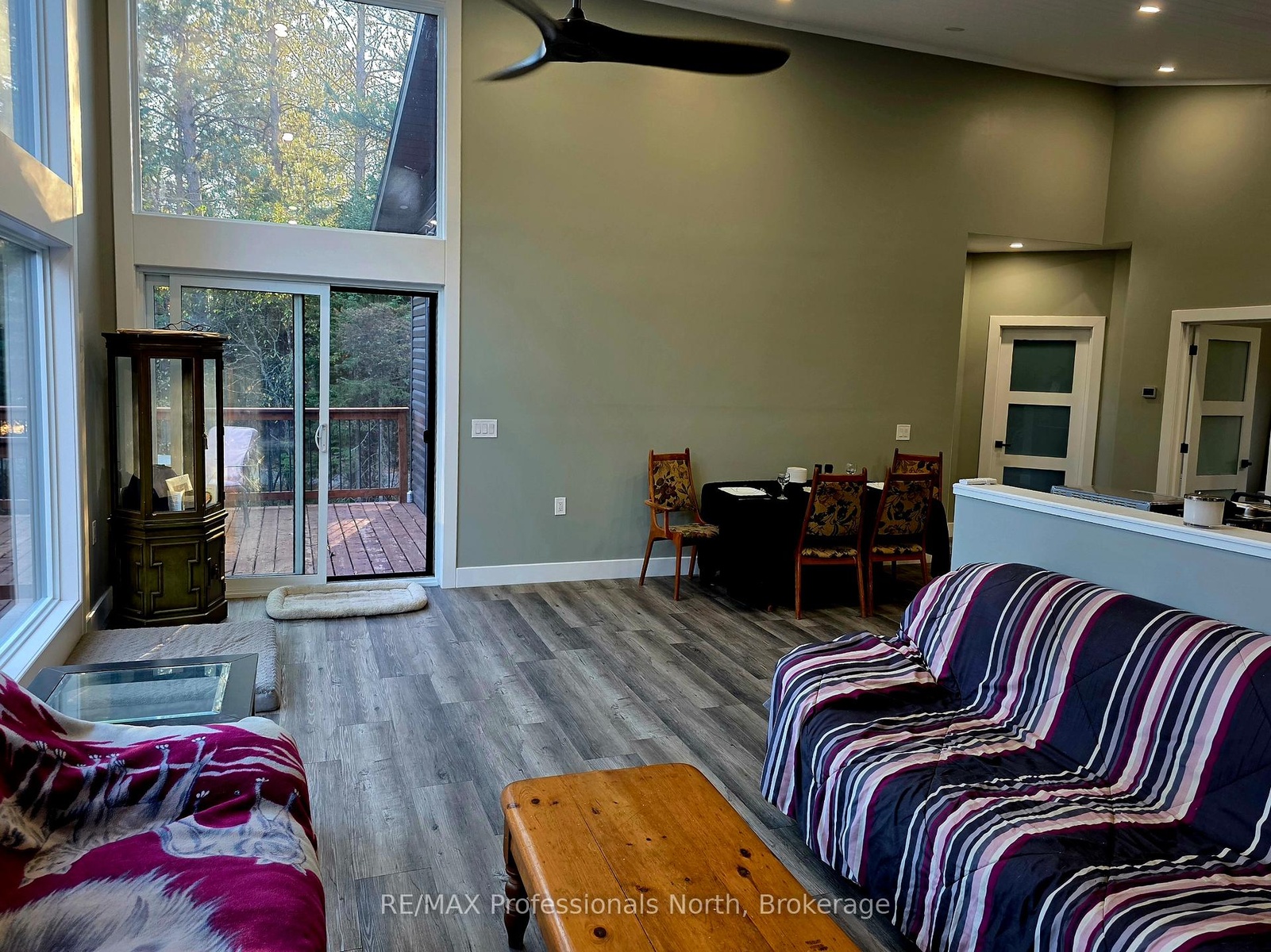Built in 2023, this beautifully crafted home blends contemporary design with the peaceful charm of a forest setting. Nestled among the trees on a private one-acre lot, it offers the perfect balance of comfort, style, and practicality just 30 minutes from Huntsville. Step inside to an inviting open-concept living space featuring soaring cathedral ceilings, energy-efficient pot lighting, and large windows that frame tranquil views of nature. The kitchen is a chefs dream, equipped with a professional Wolf range and generous counter space for entertaining or everyday cooking. With two spacious bedrooms and two full bathrooms, each with its own large walk-in shower, the layout combines functionality with luxury. An extra-wide staircase easily accommodates a chair-lift, ensuring accessibility for all. The home's thoughtful features continue with a huge three-car garage, complete with in-floor heating, battery-backup garage door openers that can be operated remotely, and a full Generac generator for peace of mind. The main living level is warmed by efficient forced-air heating and air conditioning can be easily added for year-round comfort. Enjoy morning coffee or evening sunsets from the expansive decks at both the front and rear, surrounded by the quiet beauty of the forest. If you've been searching for a modern, energy-smart home with privacy, practicality, and just the right touch of luxury - this one checks every box.