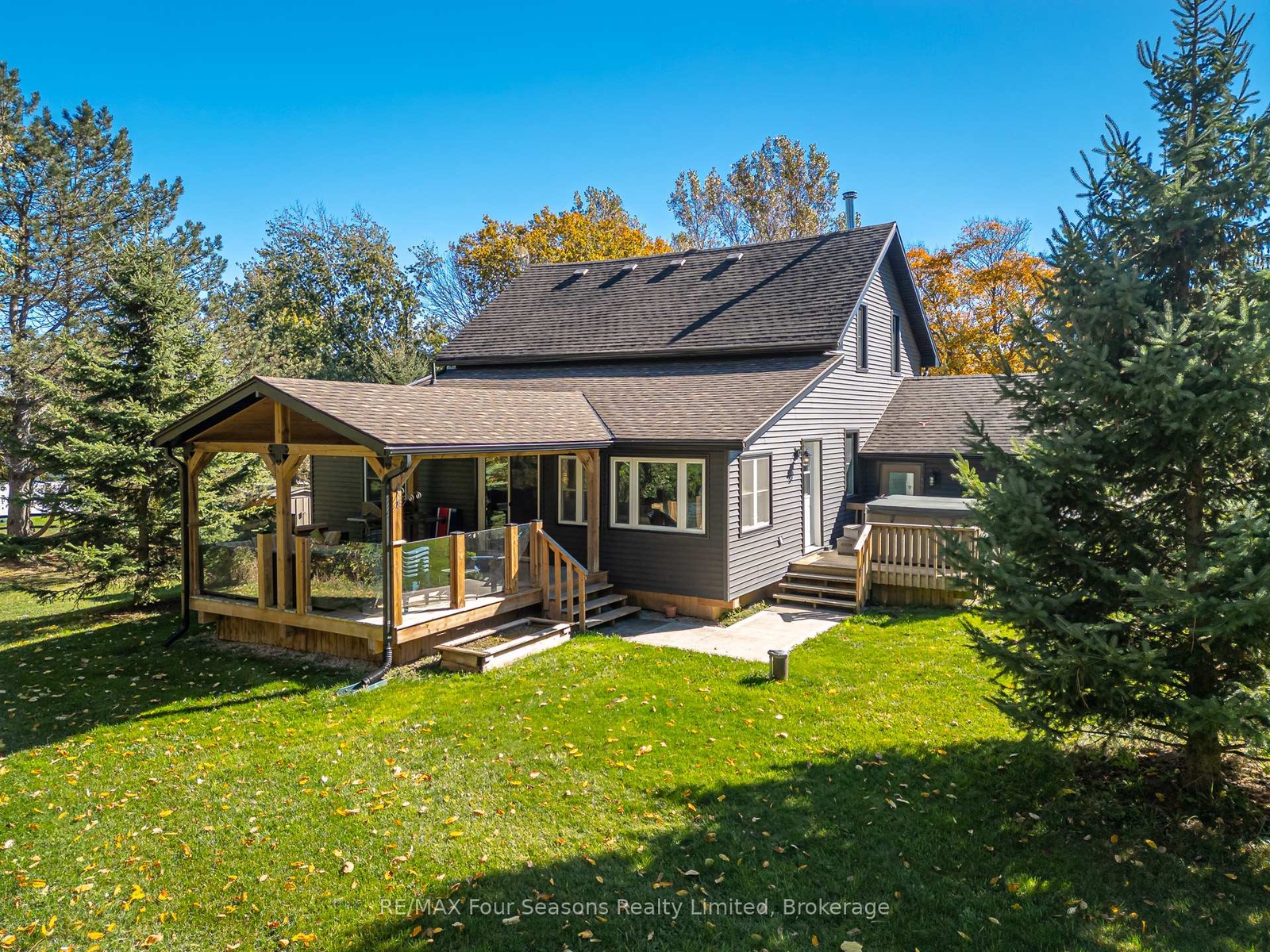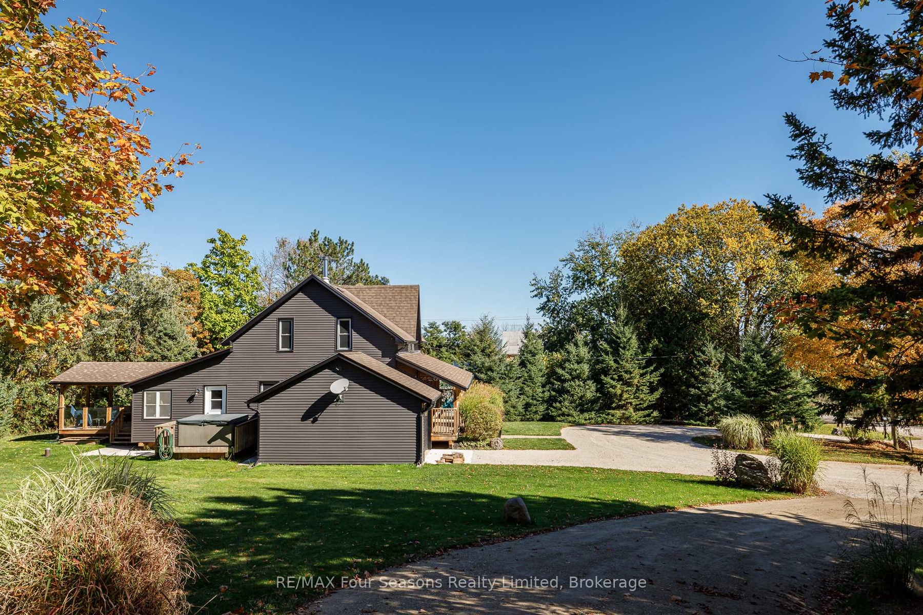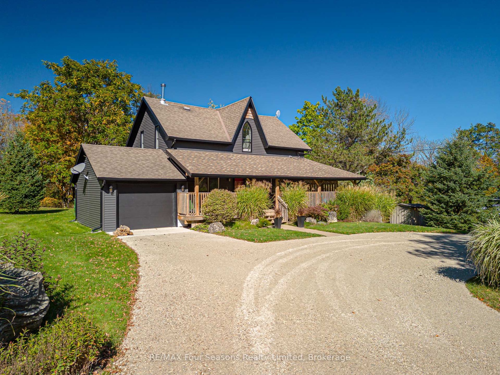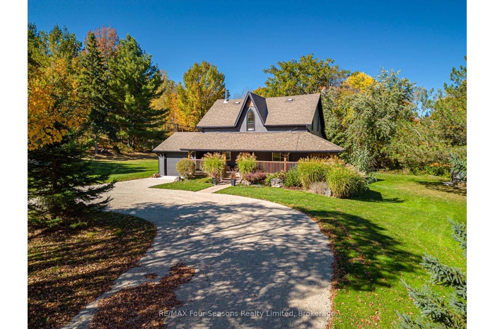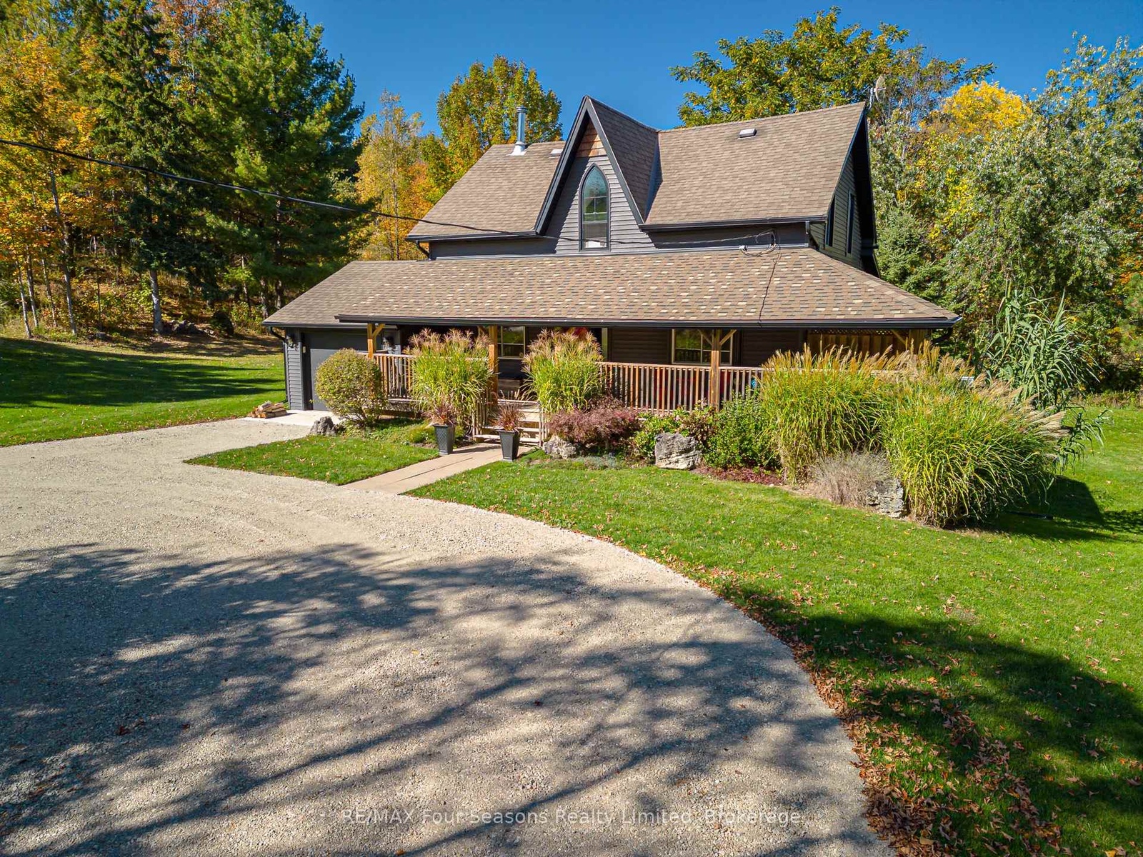 Classic country style Beaver Valley home on 1.3 beautifully landscaped acres of land. Full width covered porch with seating area at the front door. Spacious and bright interior main floor with large seating areas and dining room with wood stove. Sliding door walk out to 16'x14' covered back deck with glass railings overlooking ravine, stream and mature trees. Main floor primary suite with 3pc ensuite bath. Upstairs 4 guest bedrooms. House is heated and cooled by Geothermal forced air furnace. Full unfinished basement has plenty of storage and a walk out to ground level greenhouse. Single car attached garage. Ornamental grasses, mature trees and natural wooded surroundings combine to create a private setting. On the hillside above the house is a perfect spot for a guest house or rv / trailer capturing countryside views to Old Baldy. This home is in close proximity to the Bruce Trail, only 8 kms to Kimberley and 11kms to Beaver Valley Ski Club. Meaford Harbour is 15km to the north, as well as many other recreation areas. A peaceful location for comfortable year round country living.