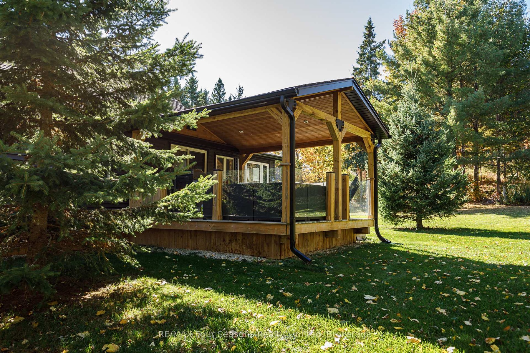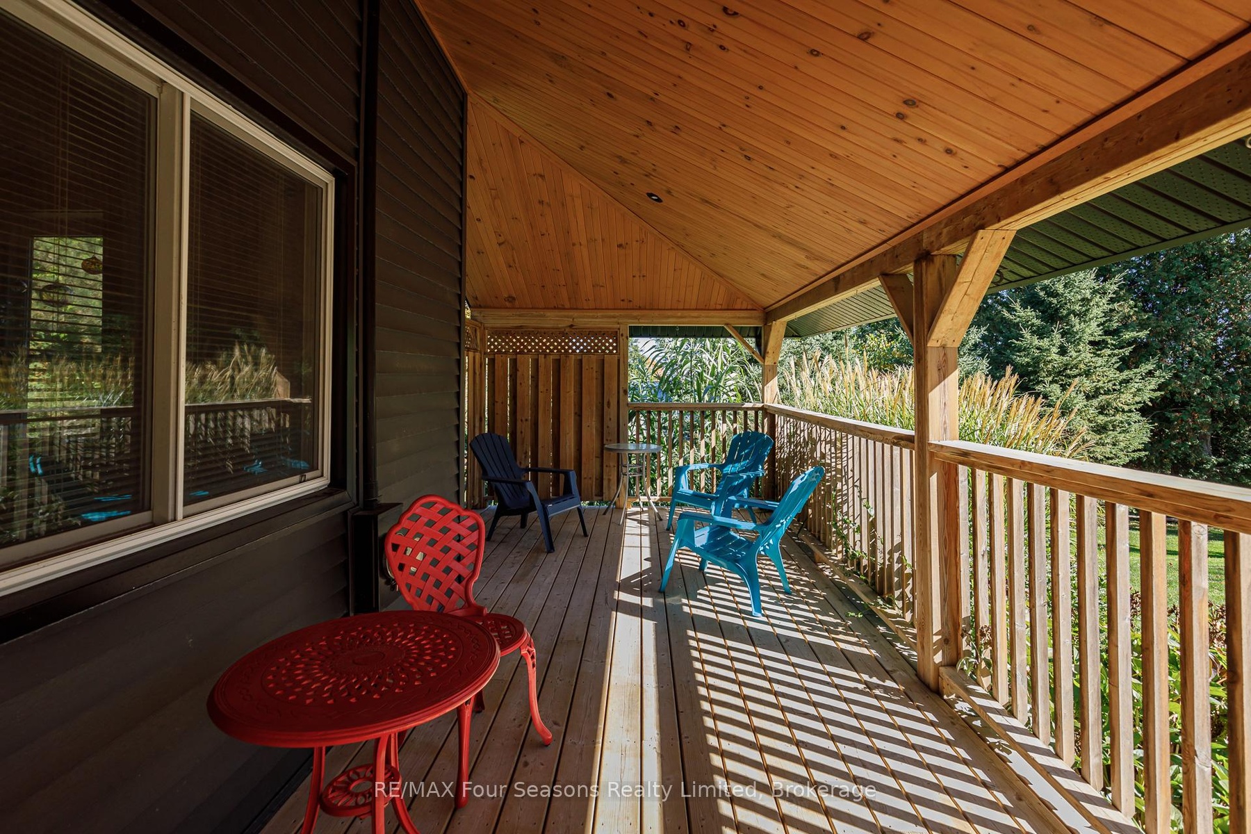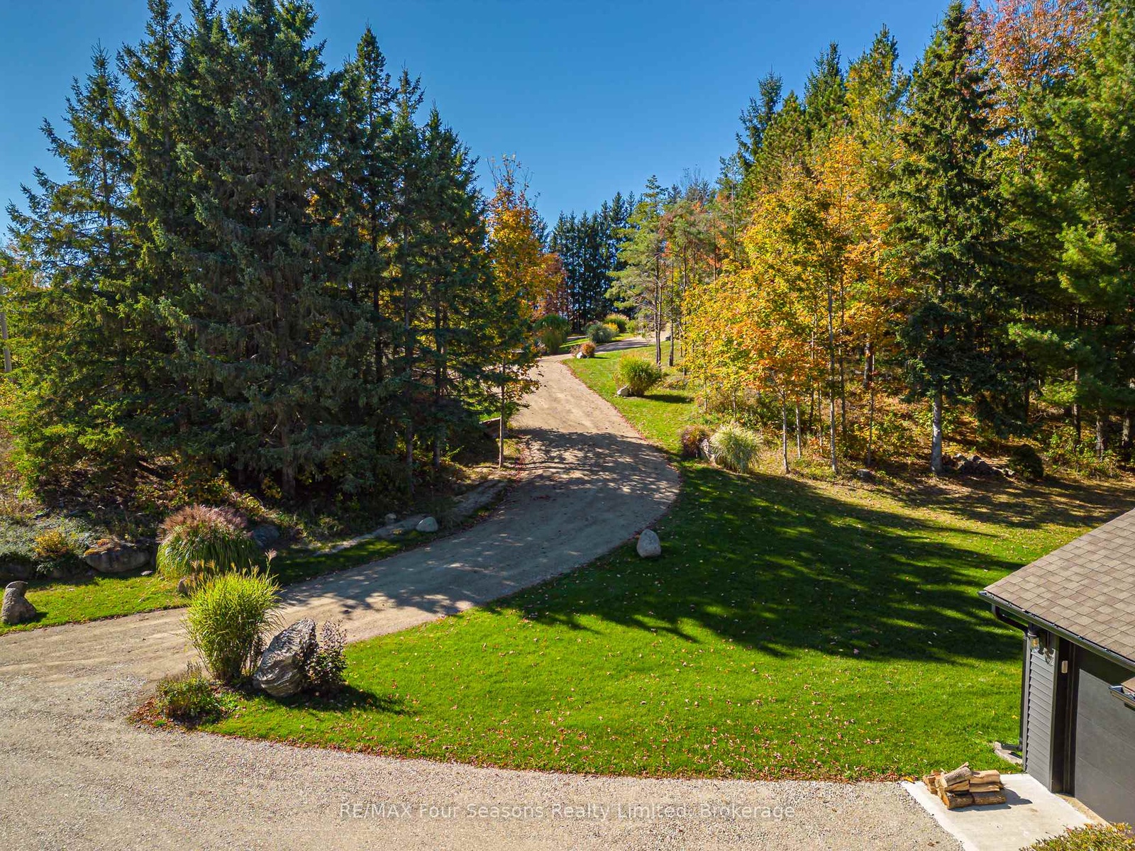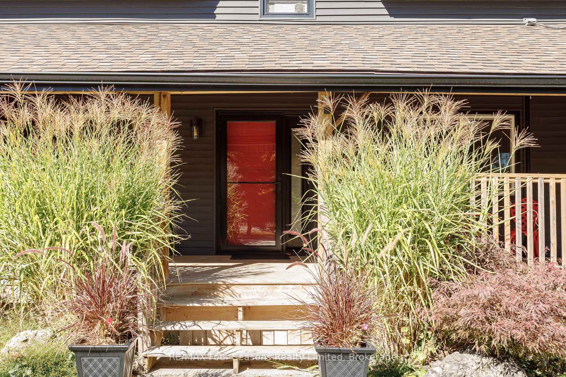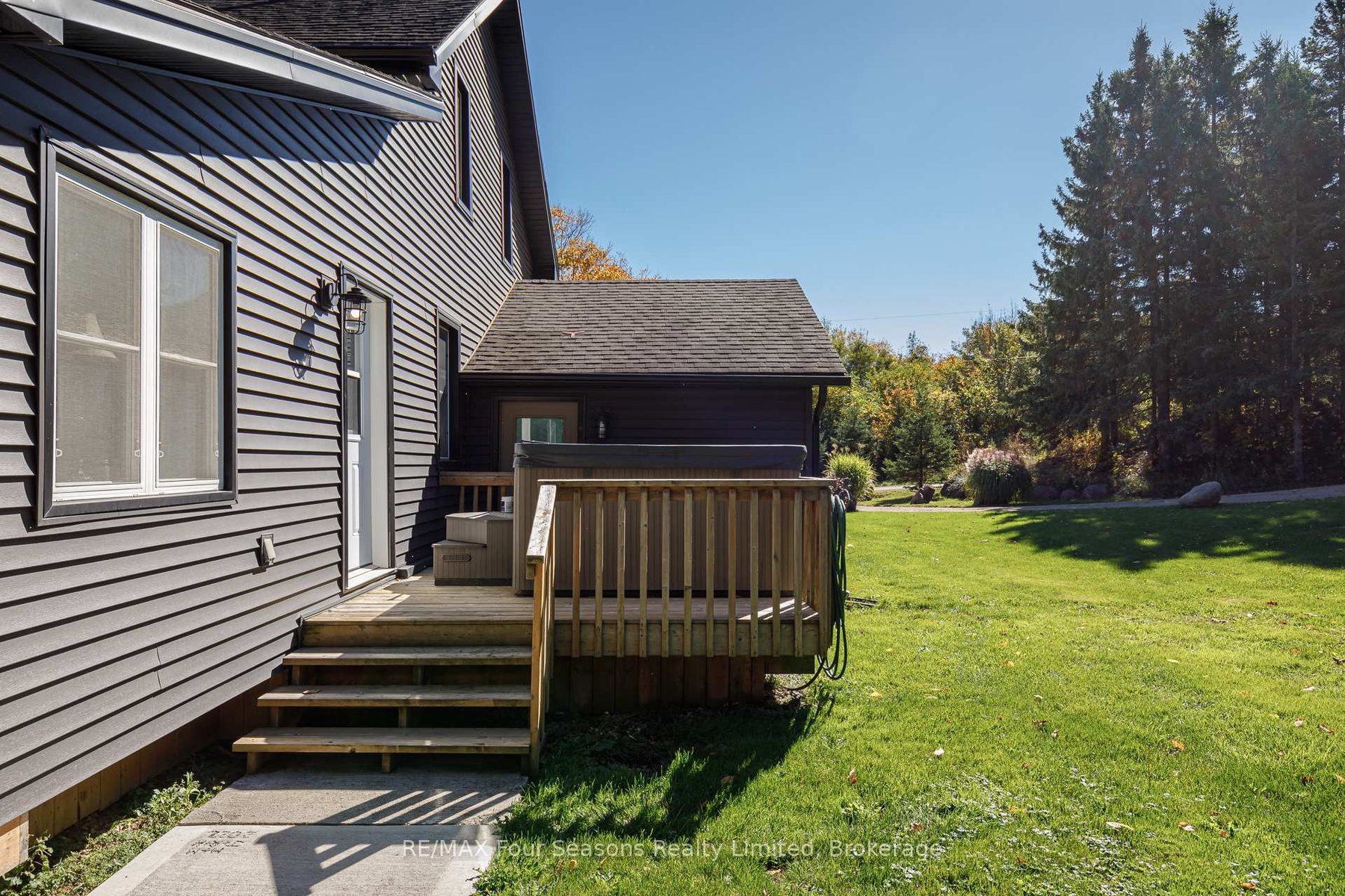 Classic country style Beaver Valley home on 1.3 beautifully landscaped acres of land. Full width covered porch with seating area at the front door. Spacious and bright interior main floor with large seating areas and dining room with wood stove. Sliding door walk out to 16'x14' covered back deck with glass railings overlooking ravine, stream and mature trees. Main floor primary suite with 3pc ensuite bath. Upstairs 4 guest bedrooms. House is heated and cooled by Geothermal forced air furnace. Full unfinished basement has plenty of storage and a walk out to ground level greenhouse. Single car attached garage. Ornamental grasses, mature trees and natural wooded surroundings combine to create a private setting. On the hillside above the house is a perfect spot for a guest house or rv / trailer capturing countryside views to Old Baldy. This home is in close proximity to the Bruce Trail, only 8 kms to Kimberley and 11kms to Beaver Valley Ski Club. Meaford Harbour is 15km to the north, as well as many other recreation areas. A peaceful location for comfortable year round country living.