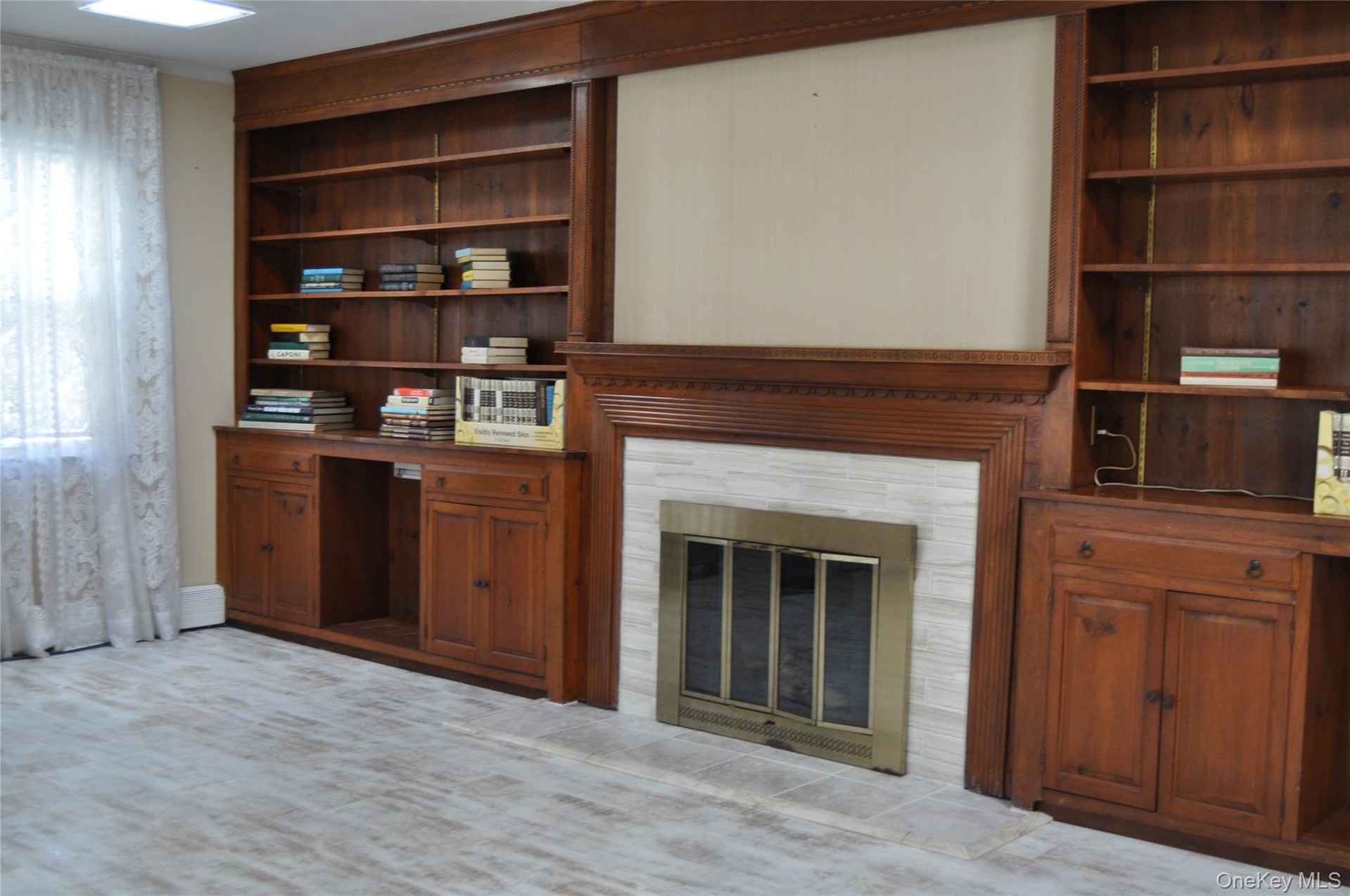 Just steps from the Connecticut River, the home welcomes you with a warm, inviting living room featuring a cozy fireplace and beautifully crafted built-in wood bookshelves.