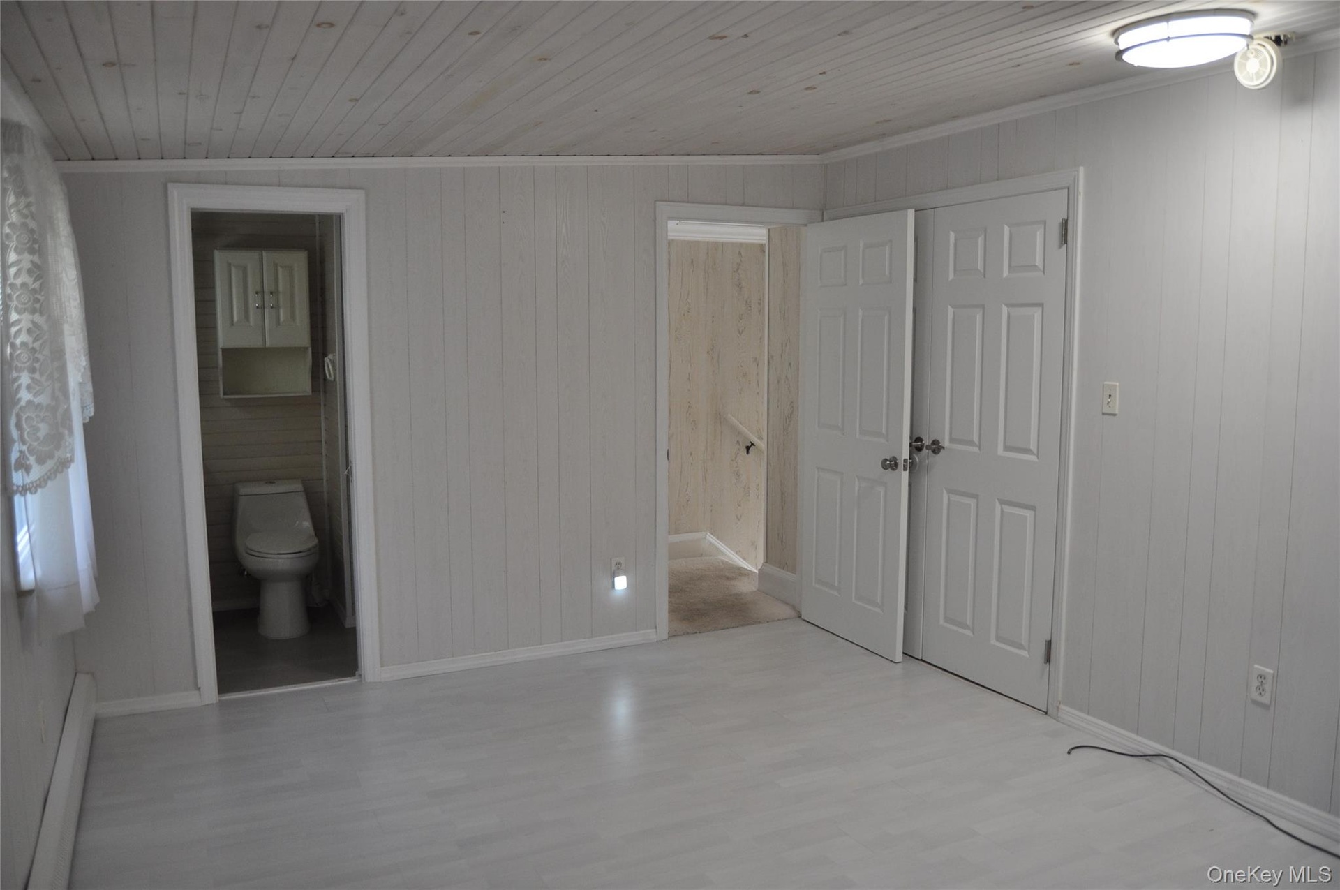 - Unfurnished bedroom featuring a baseboard radiator, wood walls, light wood-style floors, connected bathroom, and wooden ceiling