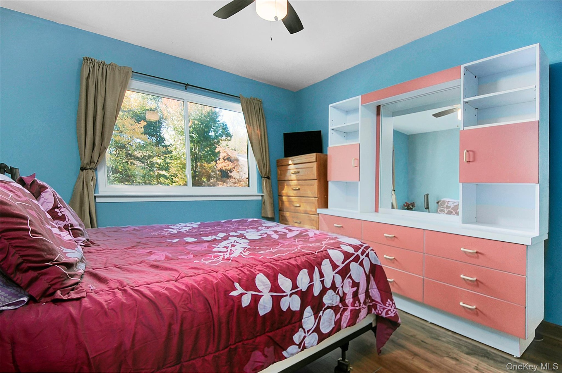 - Bedroom with dark wood-type flooring and a ceiling fan