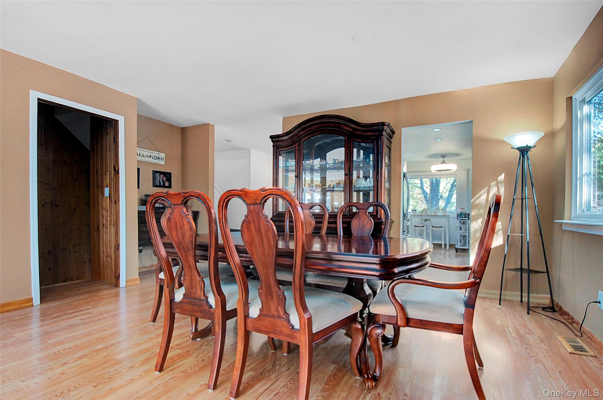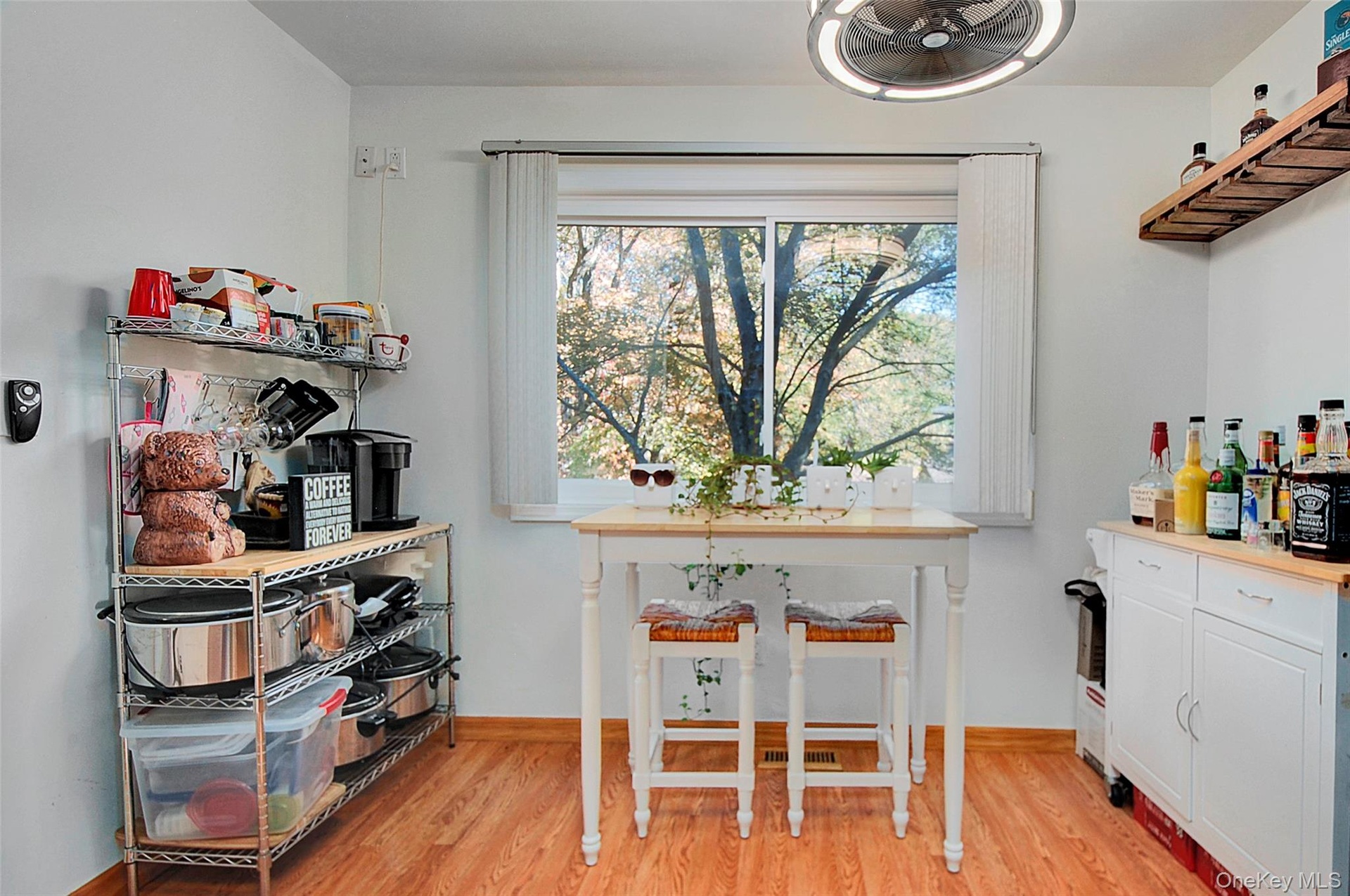 - Dining space featuring a glass covered fireplace and light wood-type flooring