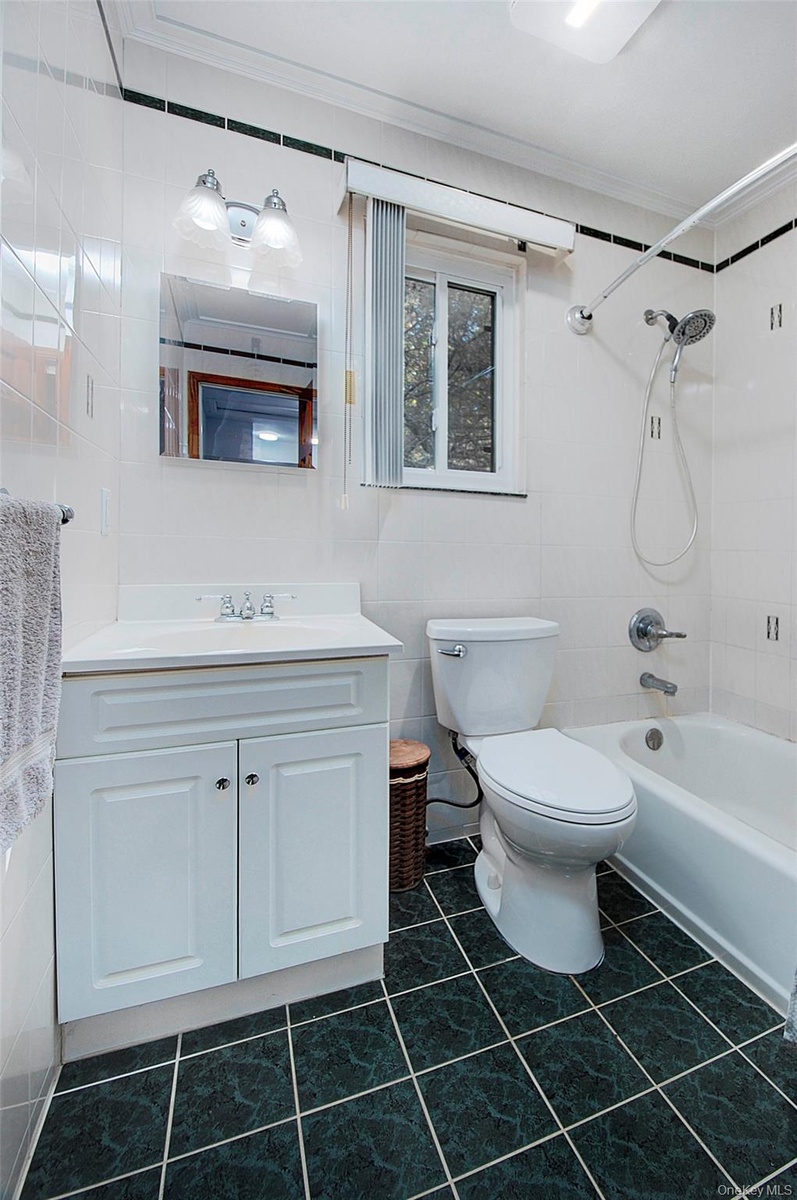 - Full bathroom with tile walls, ornamental molding, shower / bath combination, vanity, and dark tile patterned floors