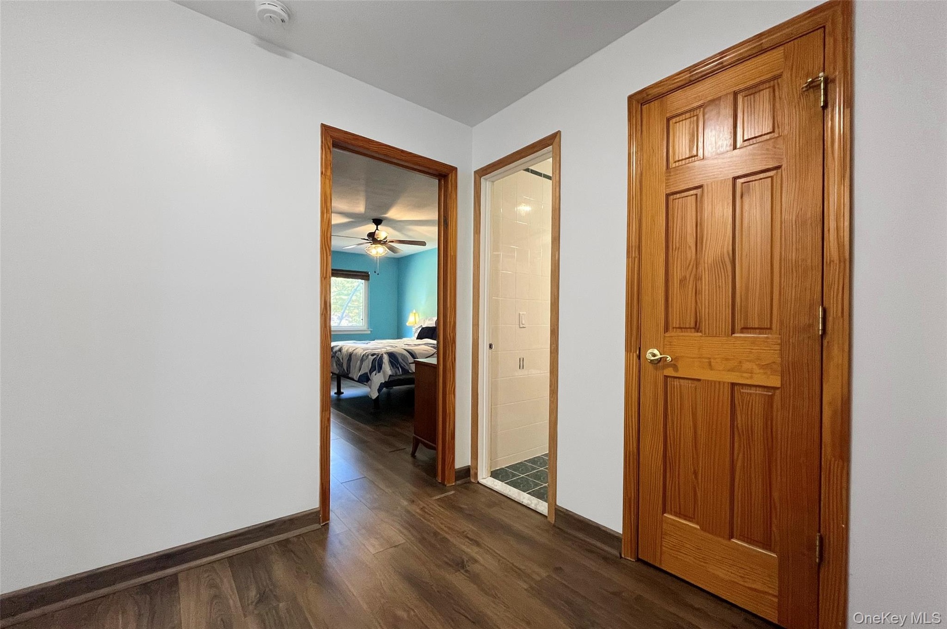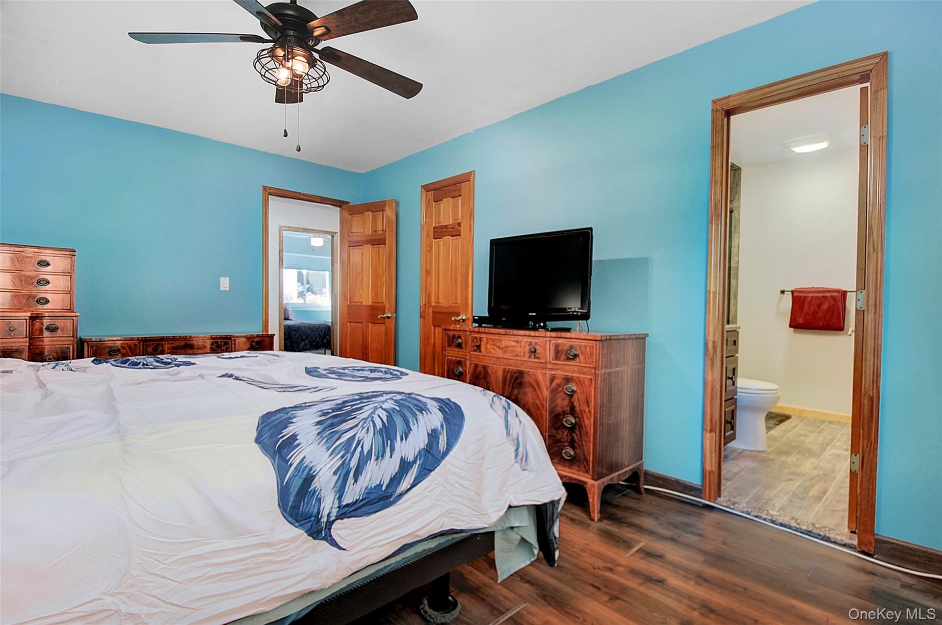 - Bedroom with dark wood-style flooring, ensuite bathroom, and a ceiling fan