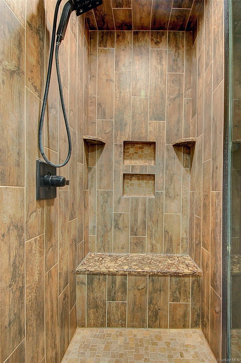 - Bathroom featuring vanity, wood finish floors, and a tile shower