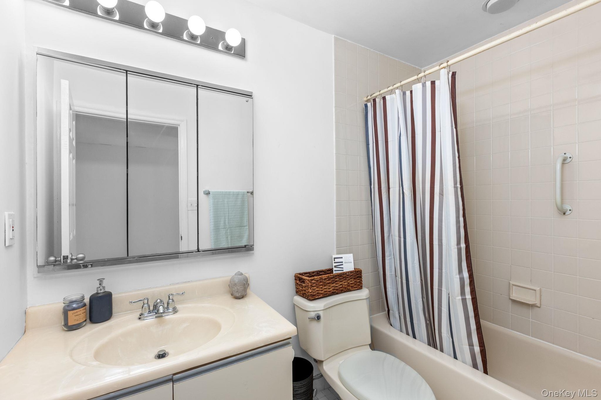 - Bathroom with shower / bath combination with curtain and vanity