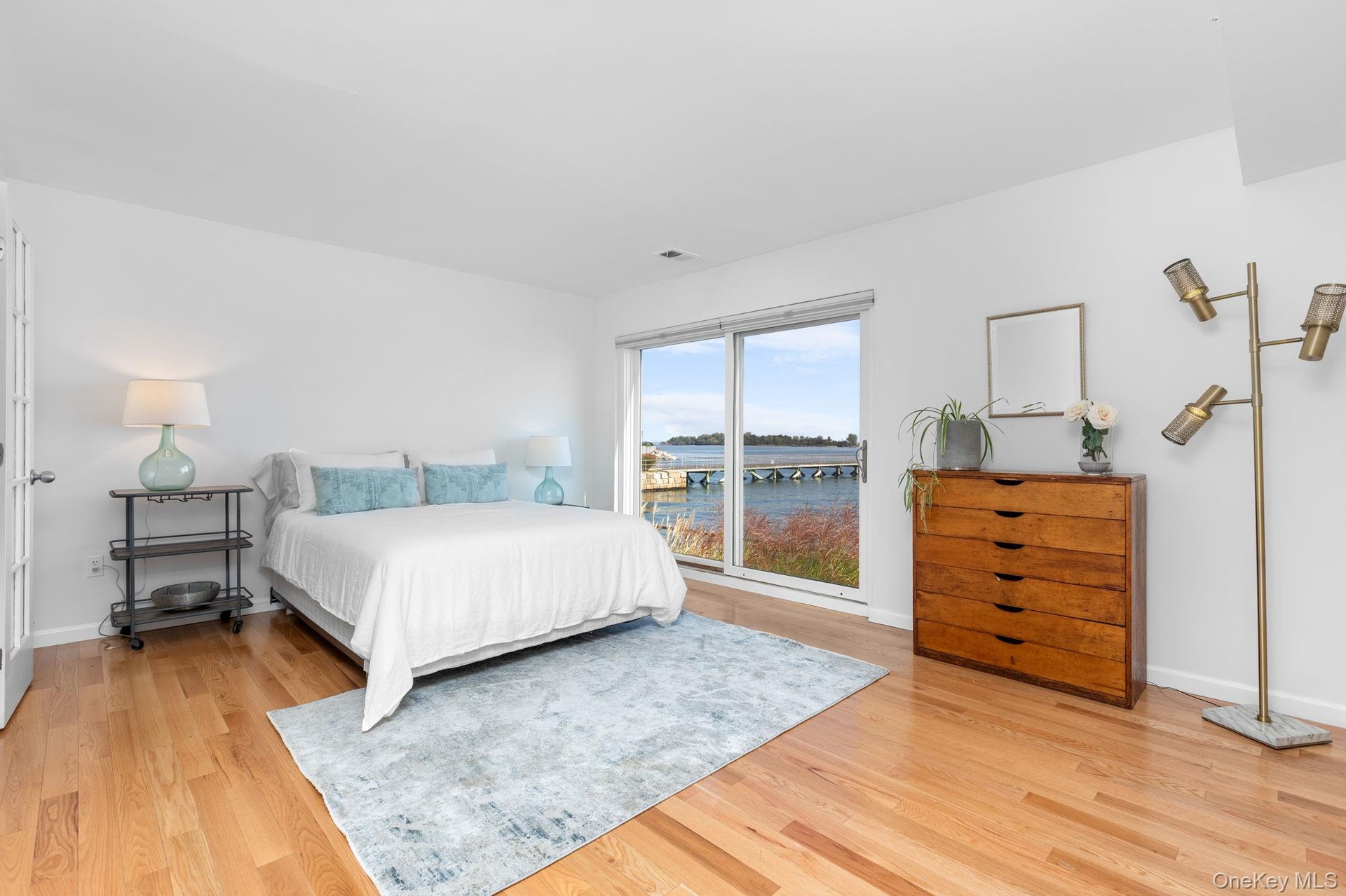 - Bedroom featuring light wood-type flooring and a water view