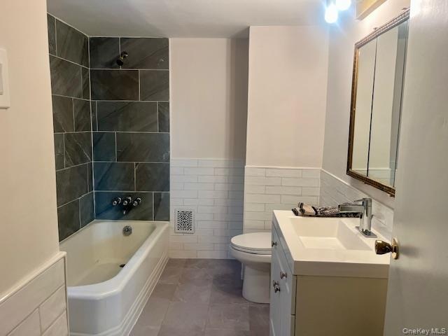 - Full bath featuring tile walls, wainscoting, vanity, shower / tub combination, and tile patterned floors