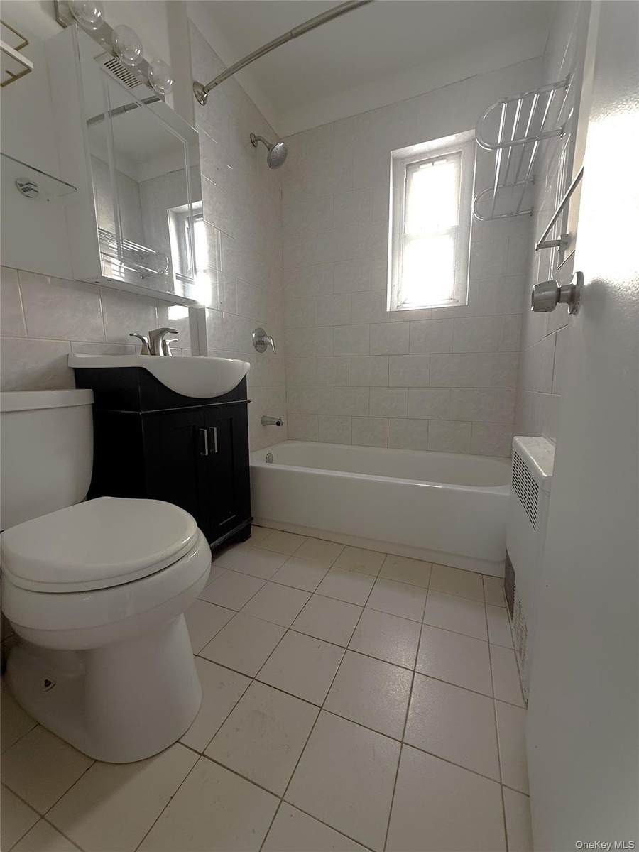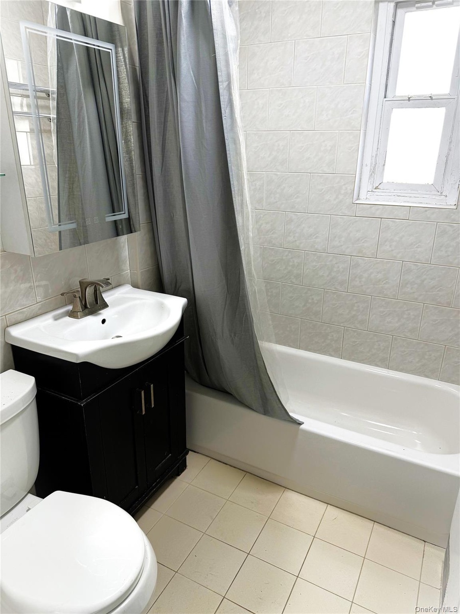 - Bathroom with shower / tub combo, light tile patterned floors, vanity, and tile walls