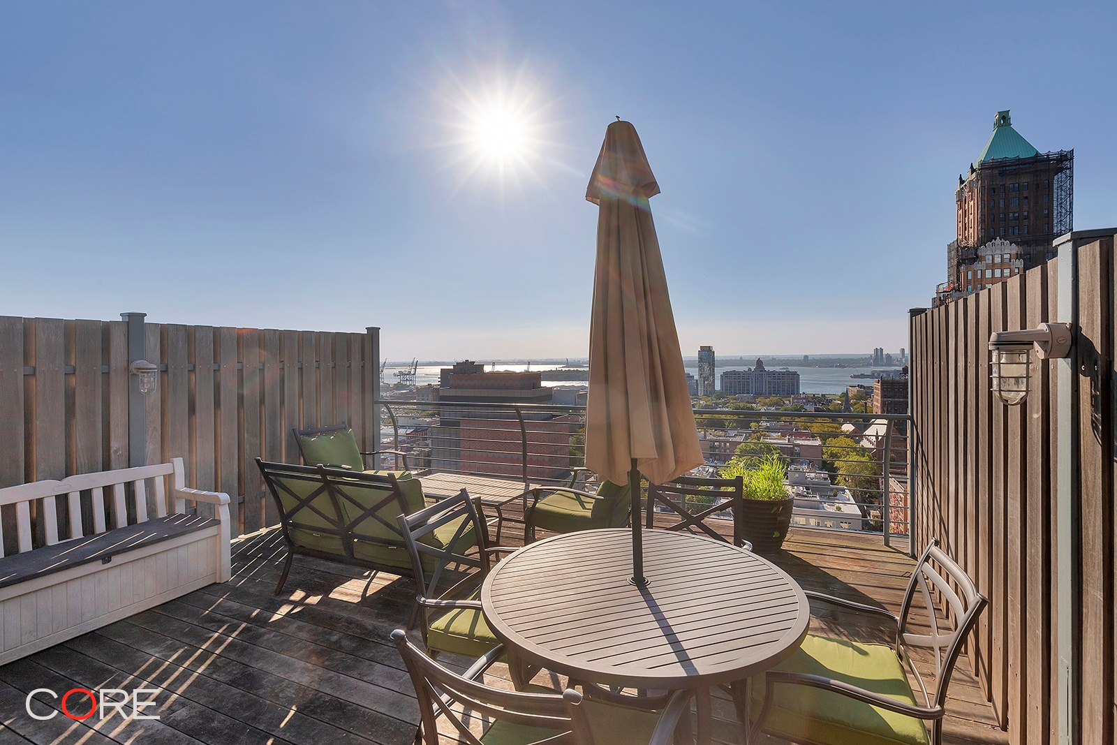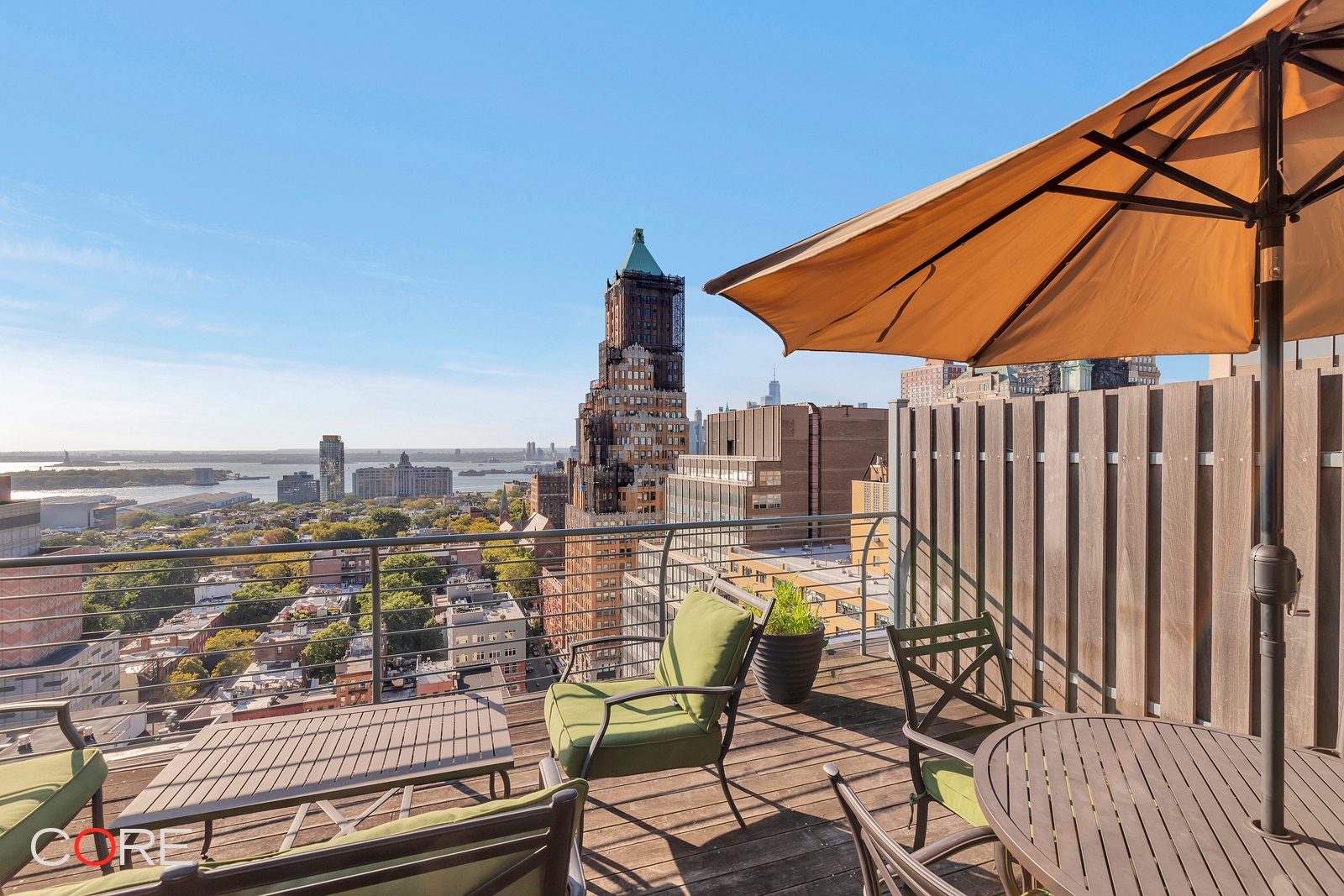 South-facing and spacious, this rarely available split two-bedroom, two-bathroom beauty comes complete with your own private 300 sq. ft roof deck cabana, granting you sweeping unobstructed views of the Statue of Liberty and New York Harbor.