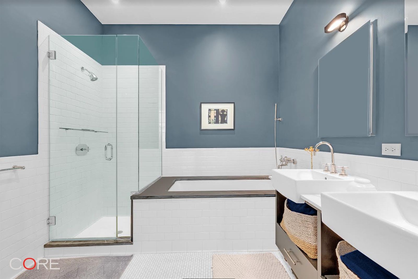 This perfectly designed sun-filled loft features an open chef's kitchen outfitted with top-of-the-line stainless steel appliances including a Sub-Zero refrigerator, Viking Stove, Bosch dishwasher, and lovely quartz countertops. The thoughtful split bedroom layout features a king-size primary bedroom with two large closets and a beautifully appointed oversized en-suite bath that boasts a jacuzzi soaking tub, a separate stall shower, and double sinks. The spacious second bedroom has a double-wide closet and is adjacent to a full-size bathroom with a combination tub and shower which has been nicely renovated with white subway tiles.