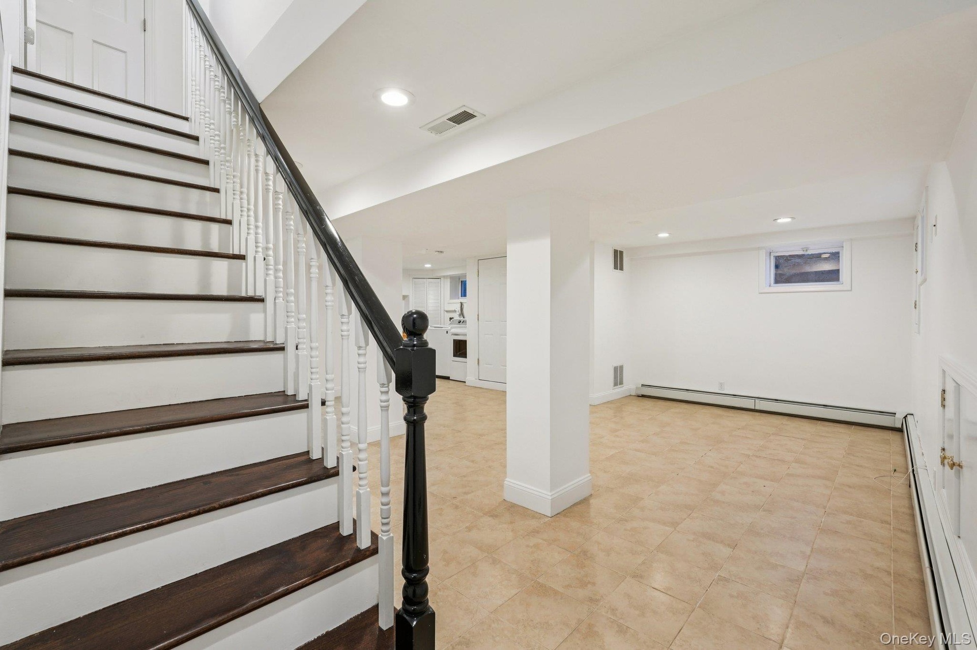 - Finished basement featuring a baseboard radiator, recessed lighting, and stairs
