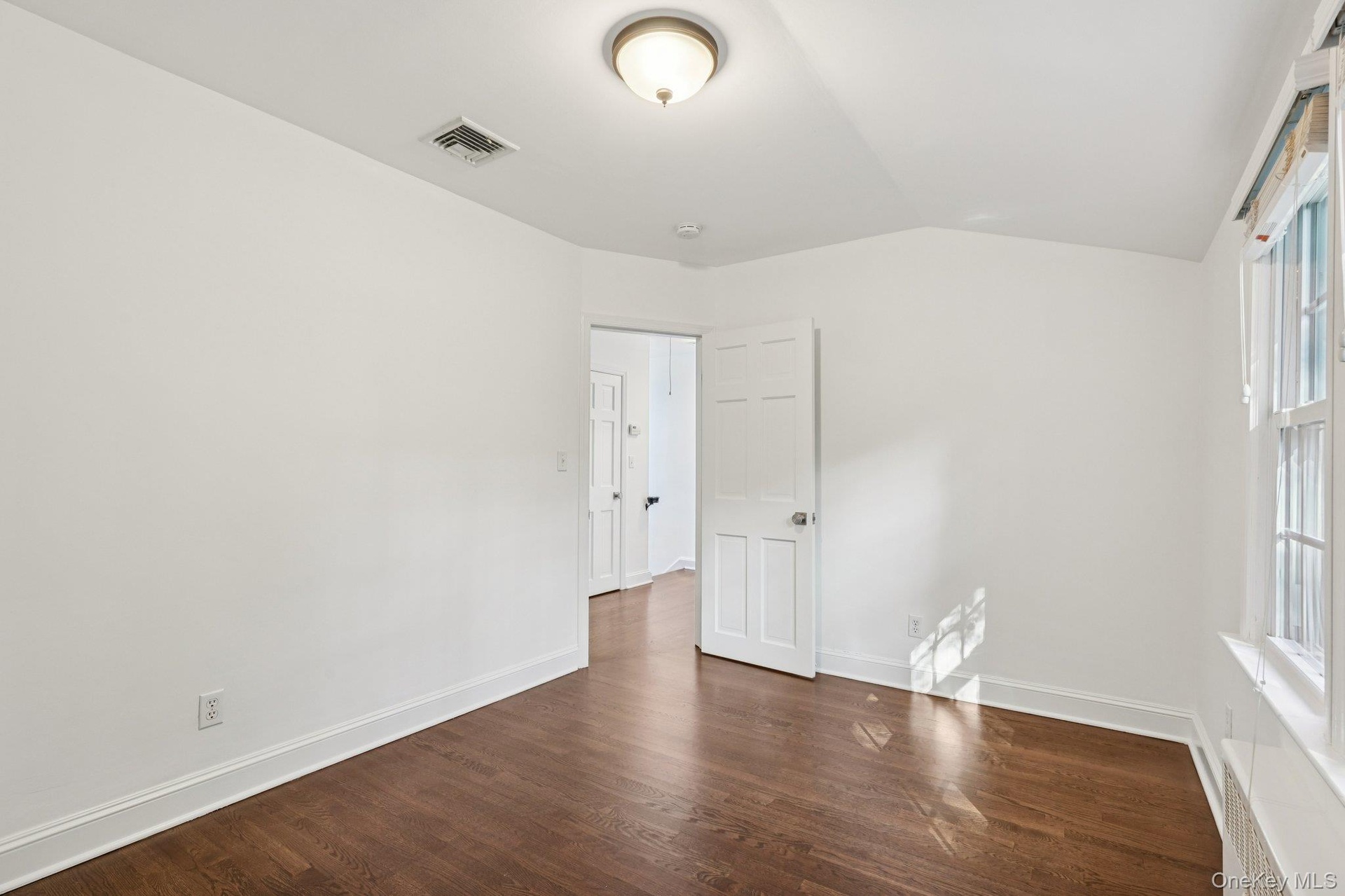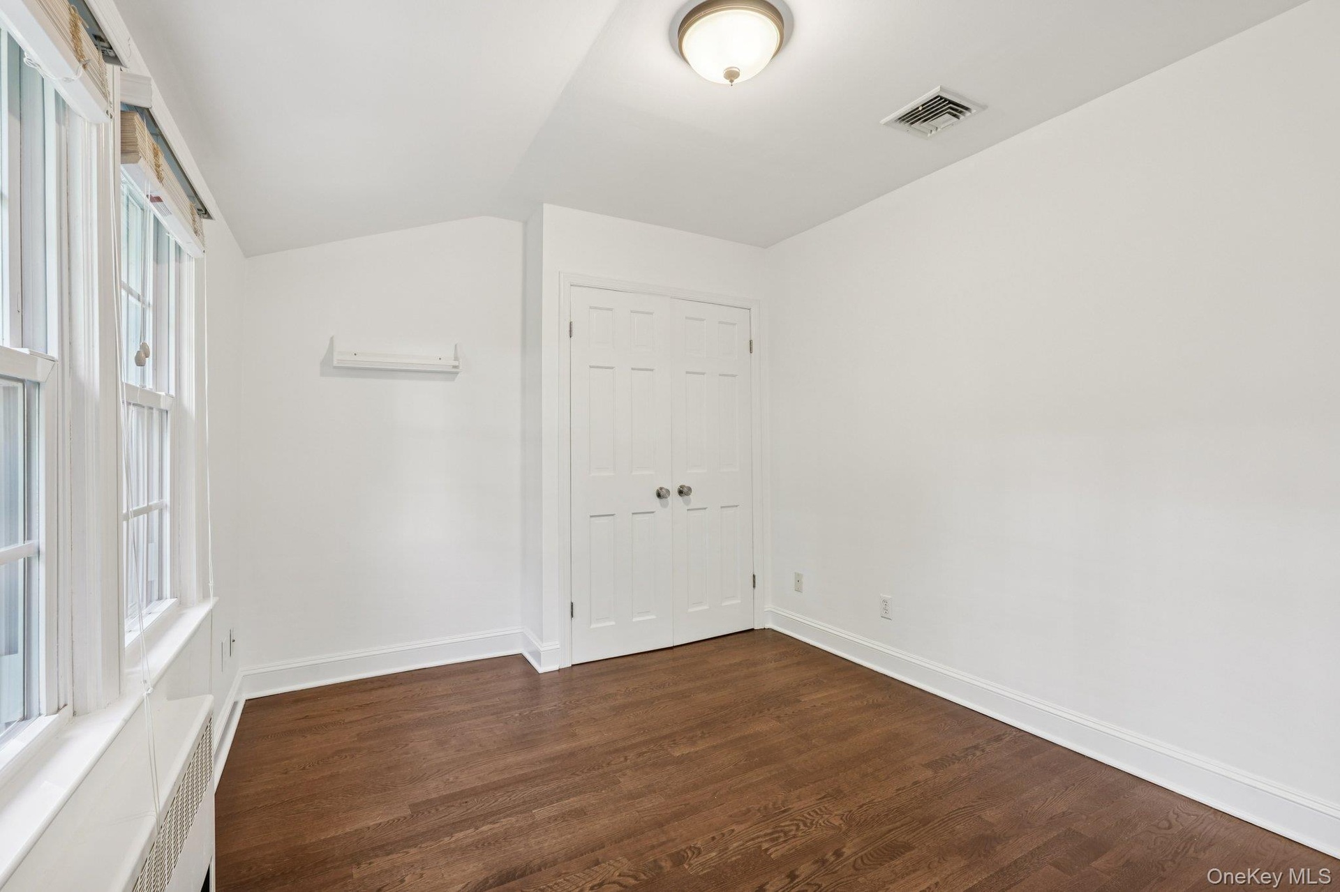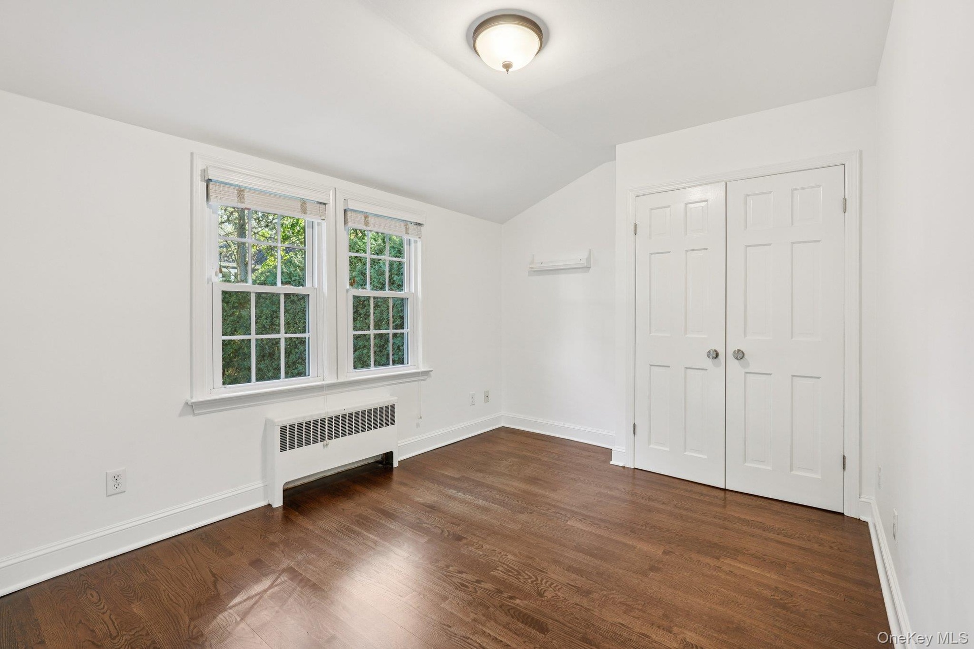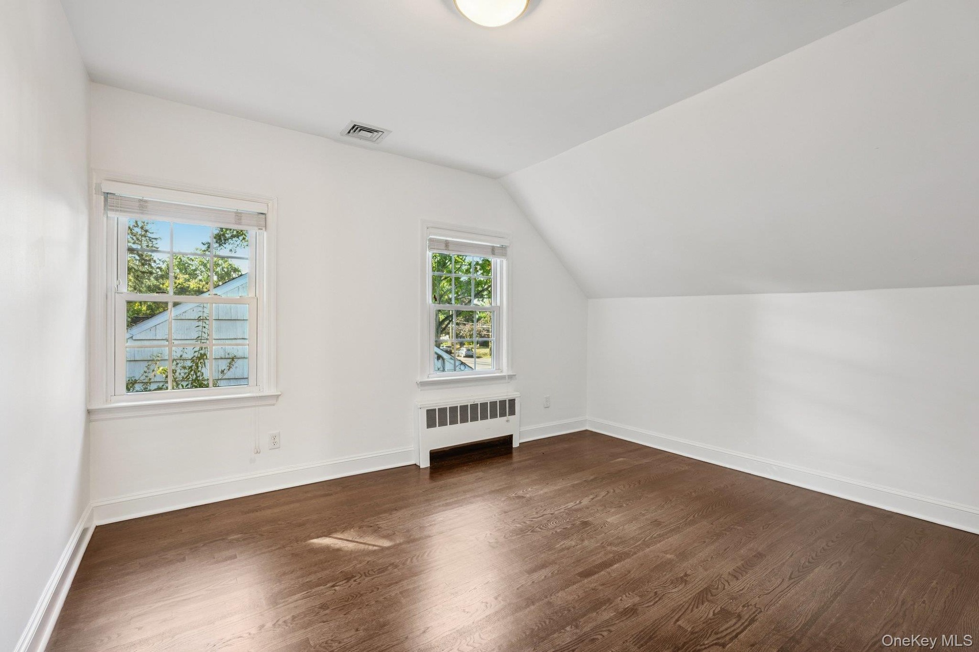 - Additional living space with radiator heating unit, dark wood finished floors, and vaulted ceiling