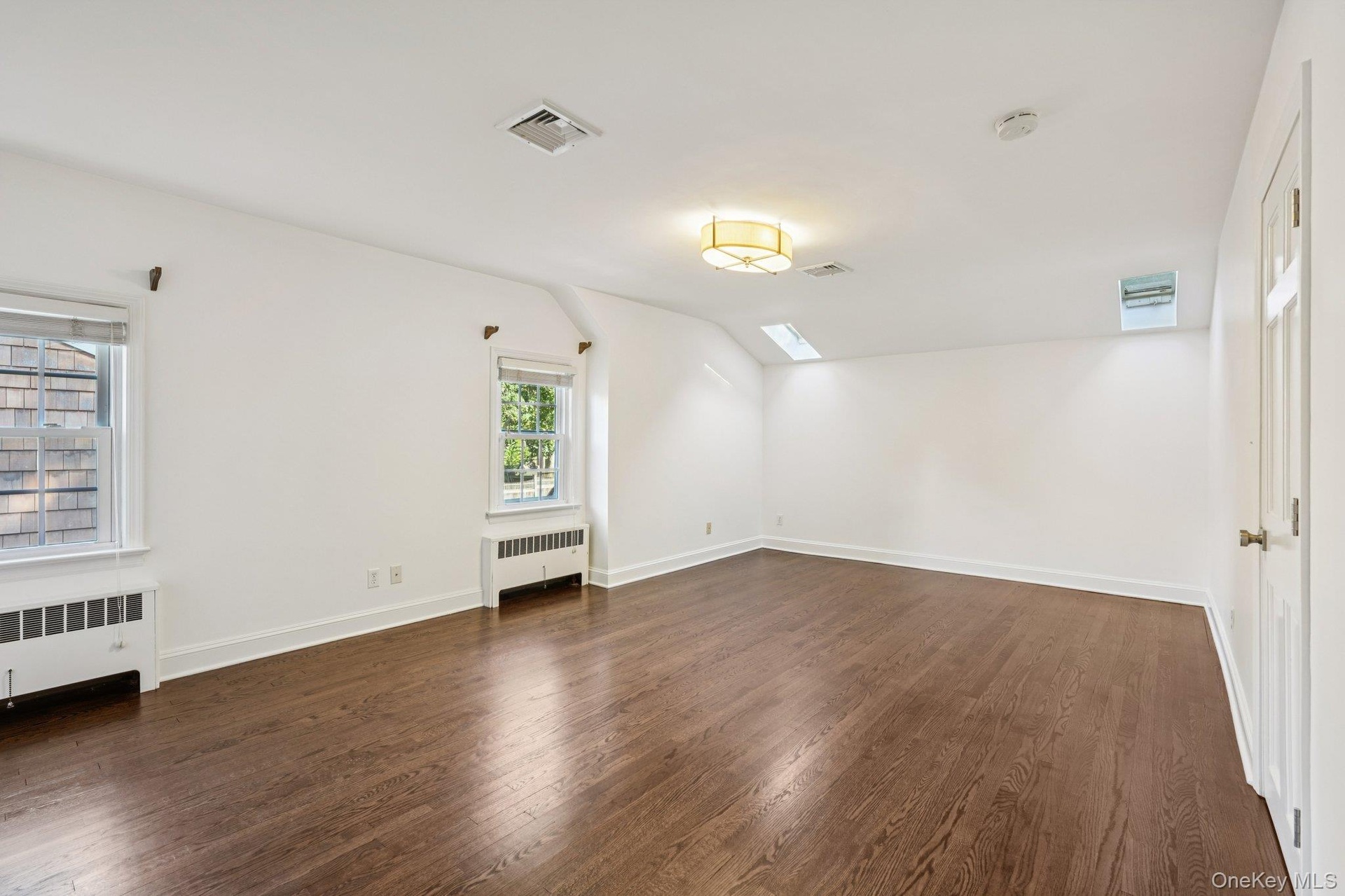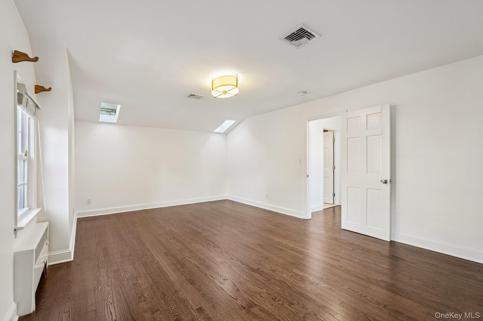 - Spare room featuring a skylight, dark wood-style flooring, and radiator