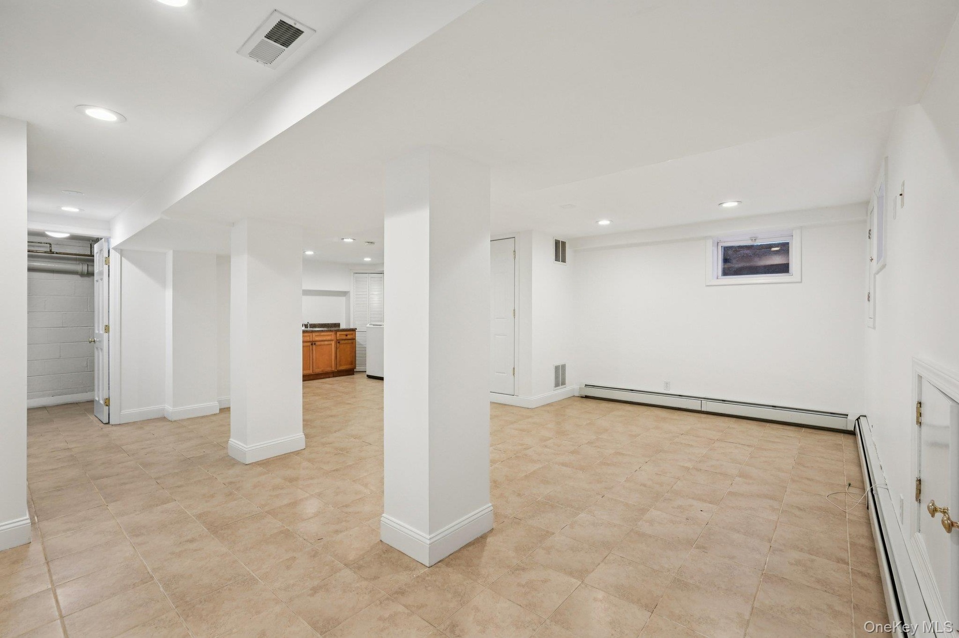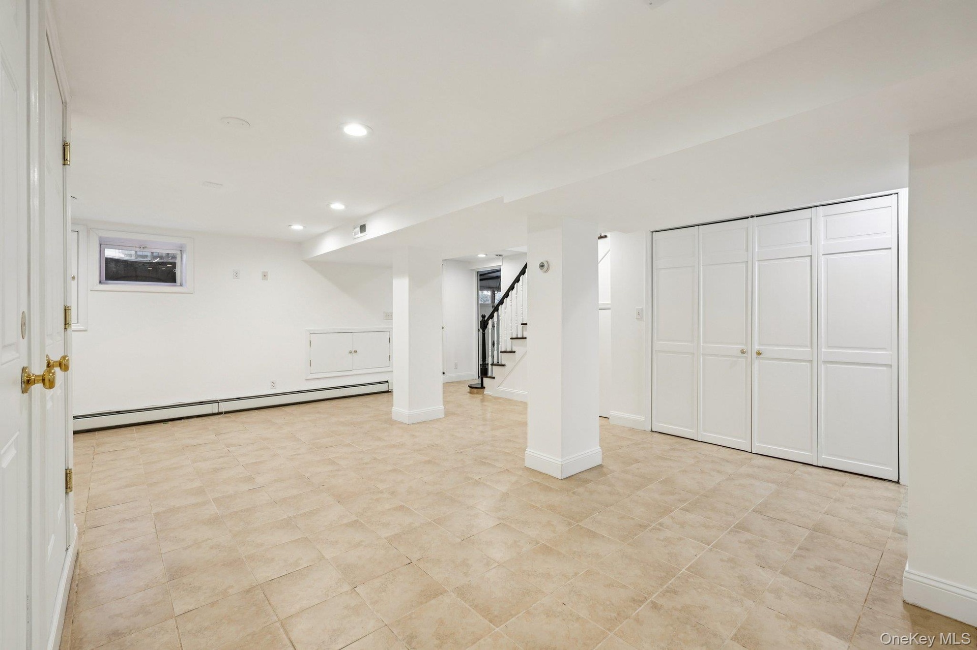 - Finished below grade area with a baseboard radiator, stairway, recessed lighting, a baseboard heating unit, and light tile patterned floors