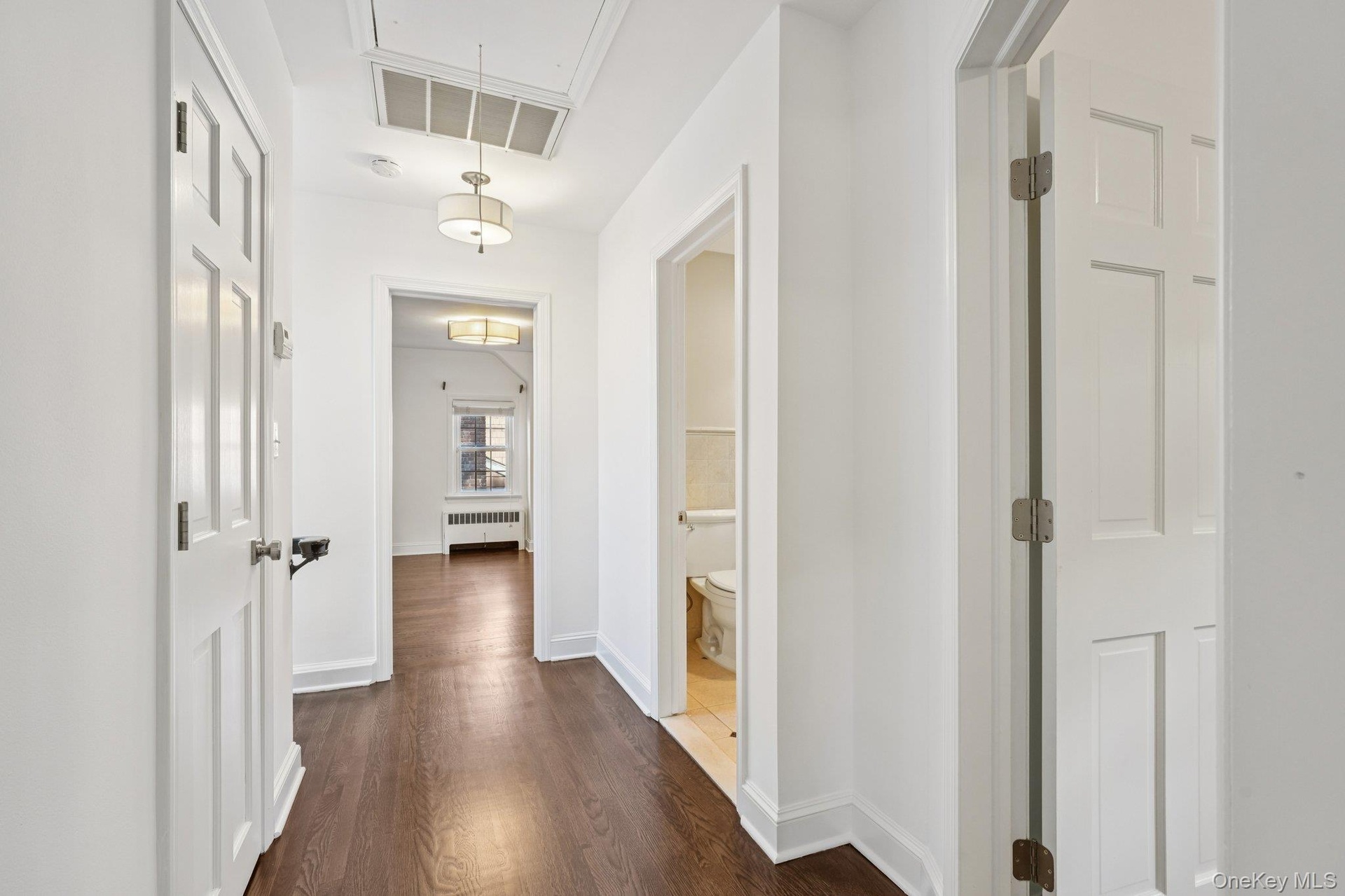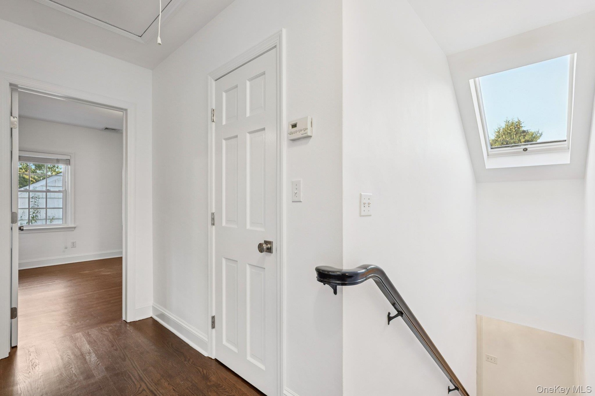 - Hallway with an upstairs landing, attic access, and dark wood-style flooring