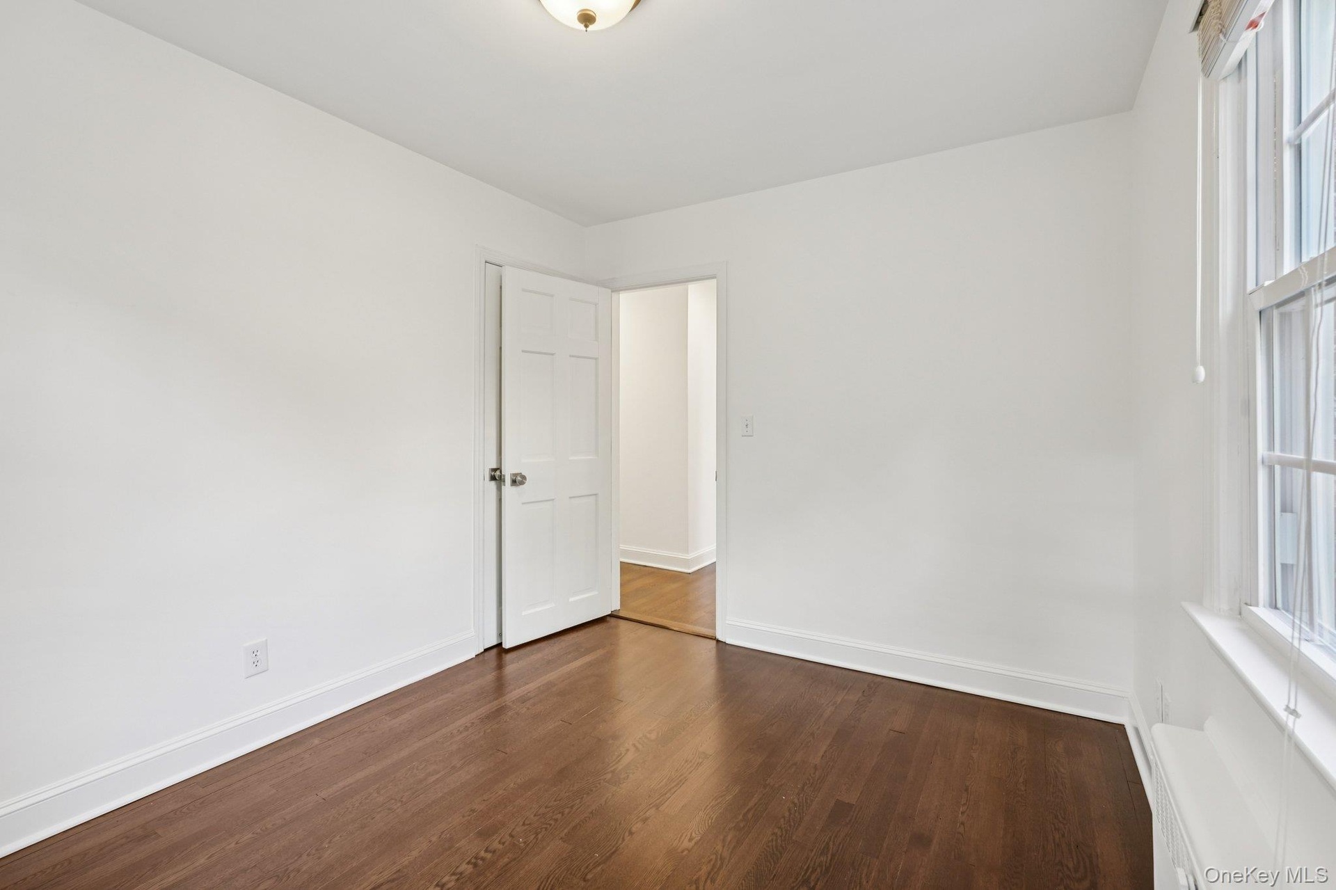 - Empty room featuring radiator heating unit and dark wood-type flooring