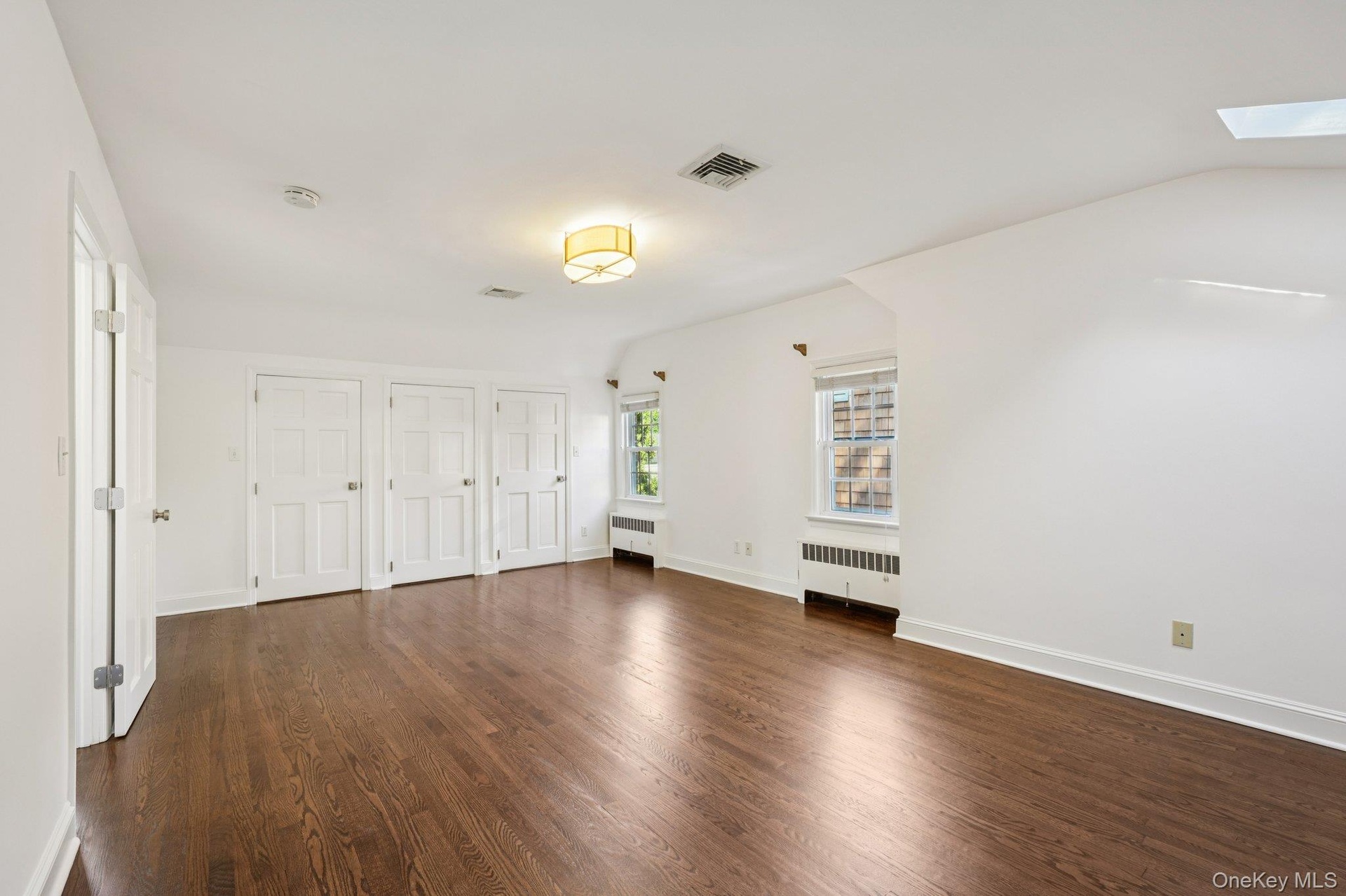 - Unfurnished bedroom featuring dark wood-style floors, a skylight, multiple closets, and radiator