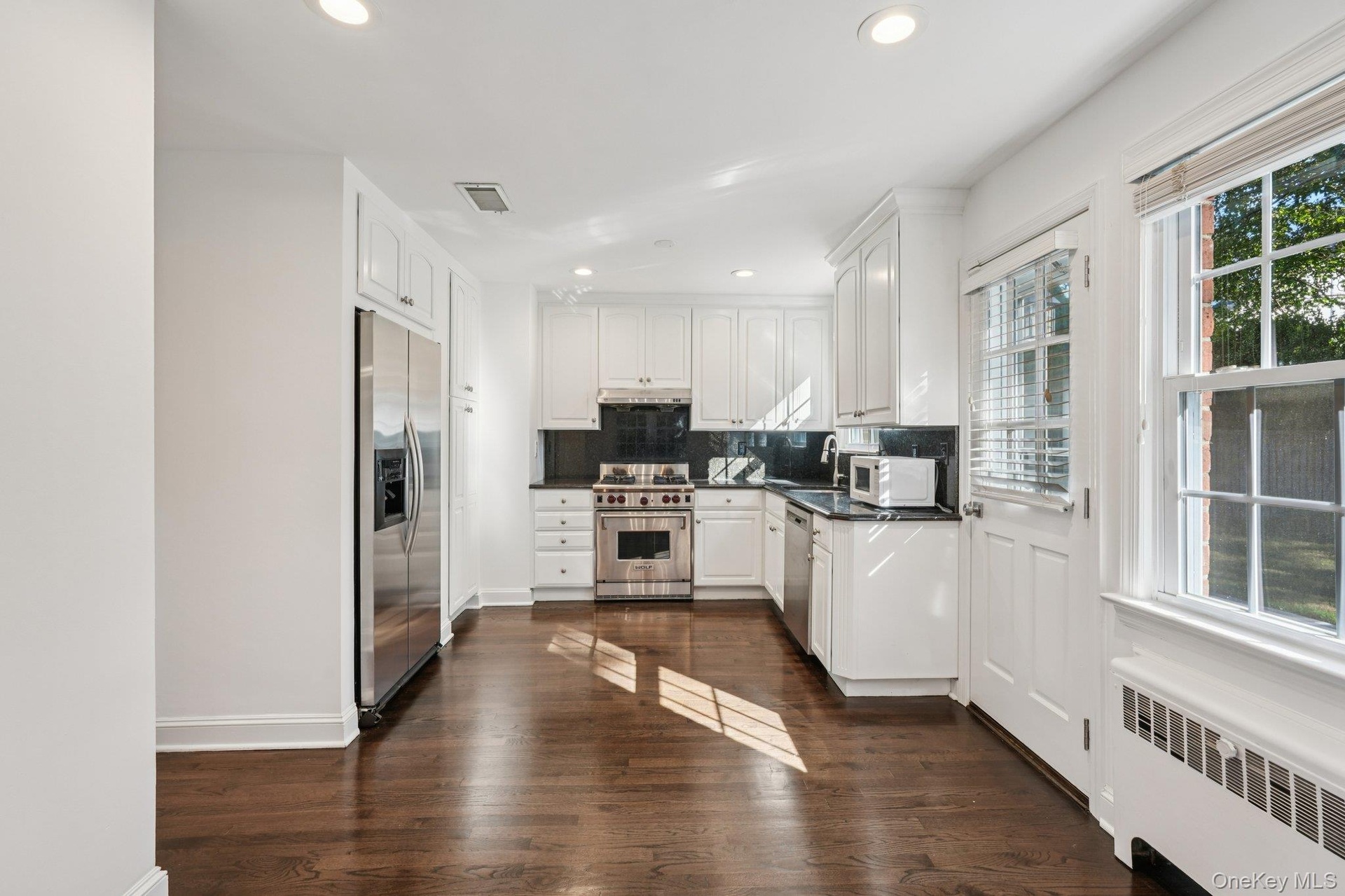 - Kitchen featuring radiator heating unit, white cabinets, appliances with stainless steel finishes, dark wood-style floors, and recessed lighting