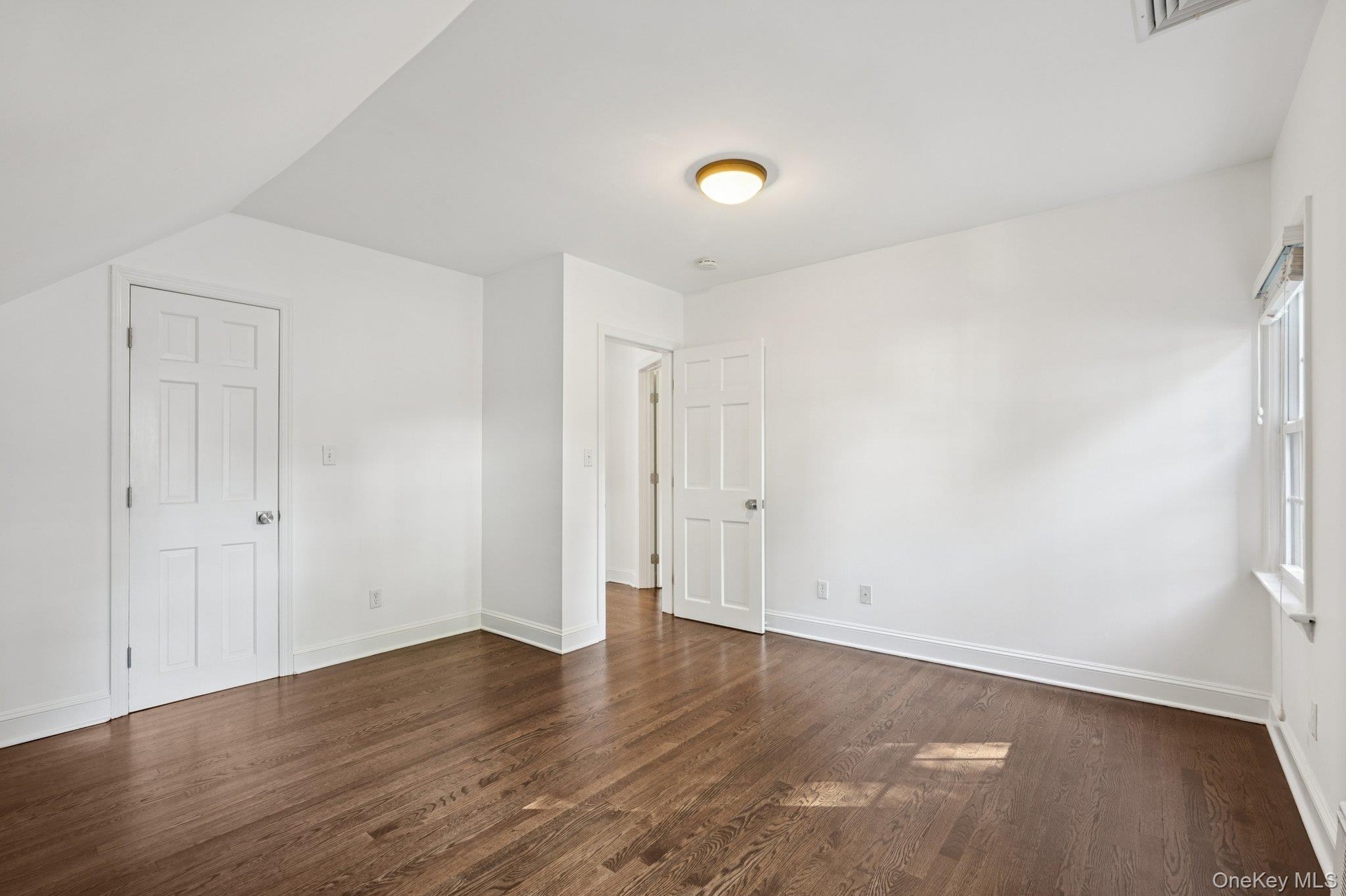 - Unfurnished bedroom with dark wood finished floors and baseboards
