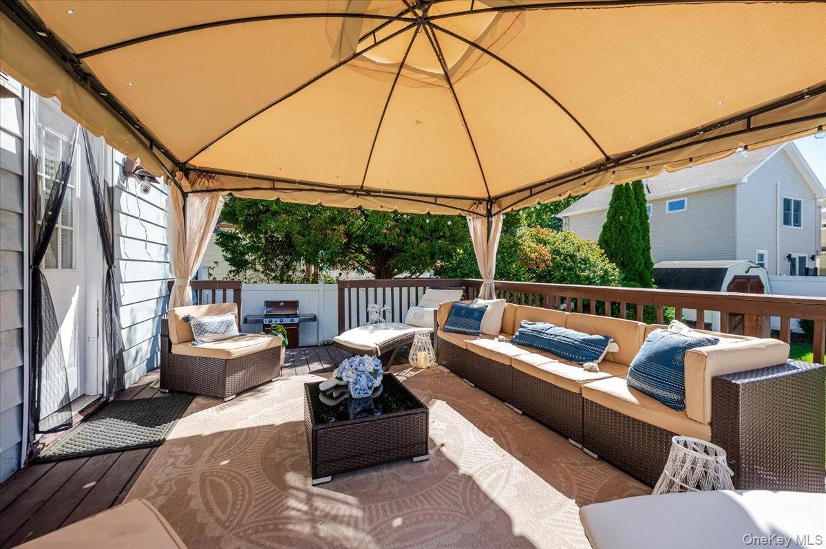 - View of patio with a gazebo, outdoor lounge area, a grill, and a deck