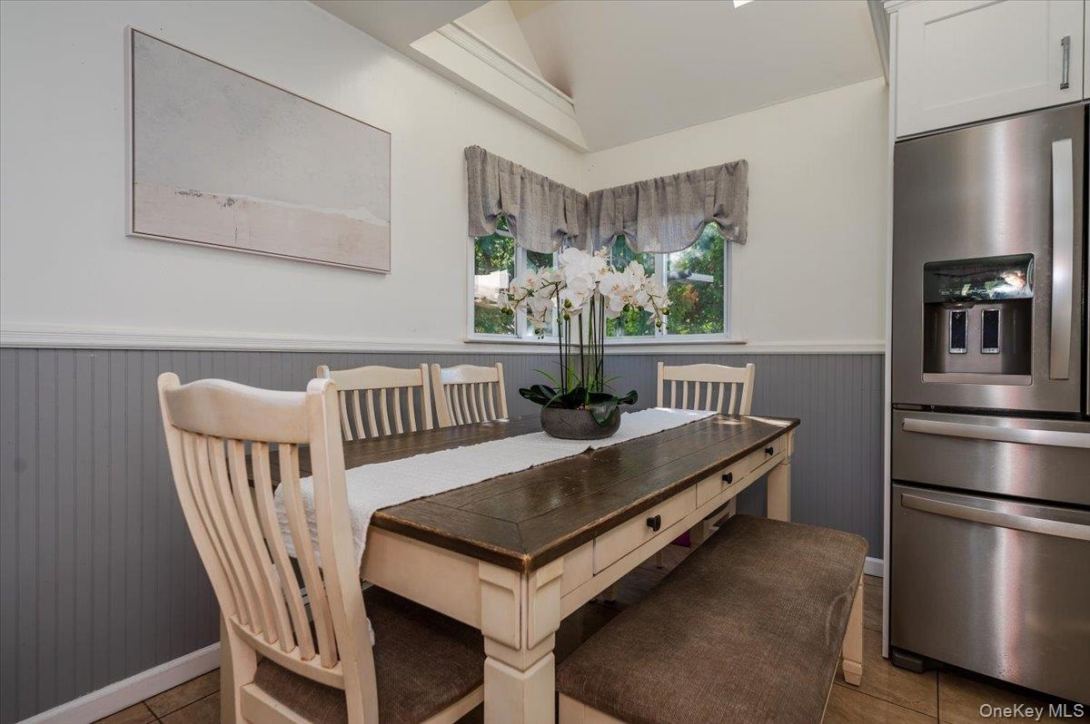 - Dining area featuring a wainscoted wall and tile patterned floors