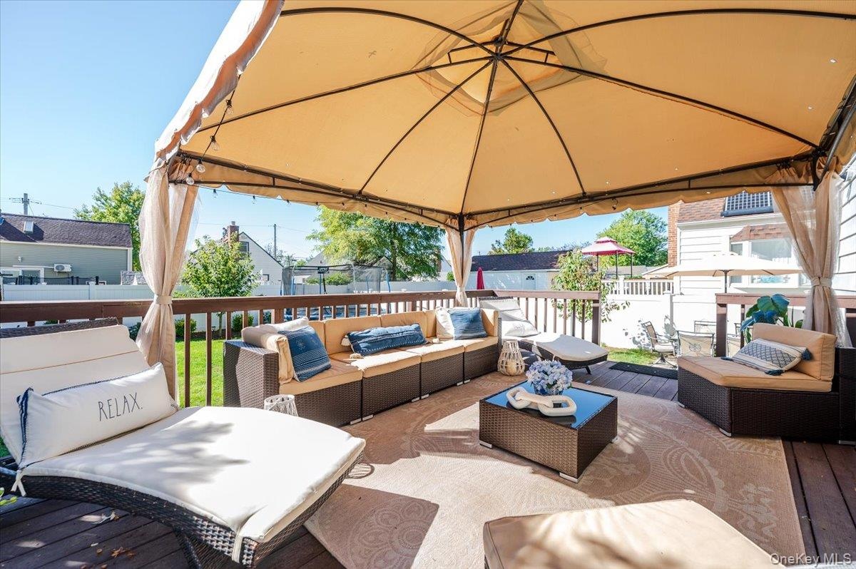 - View of patio / terrace with an outdoor hangout area, a deck, a gazebo, and a trampoline