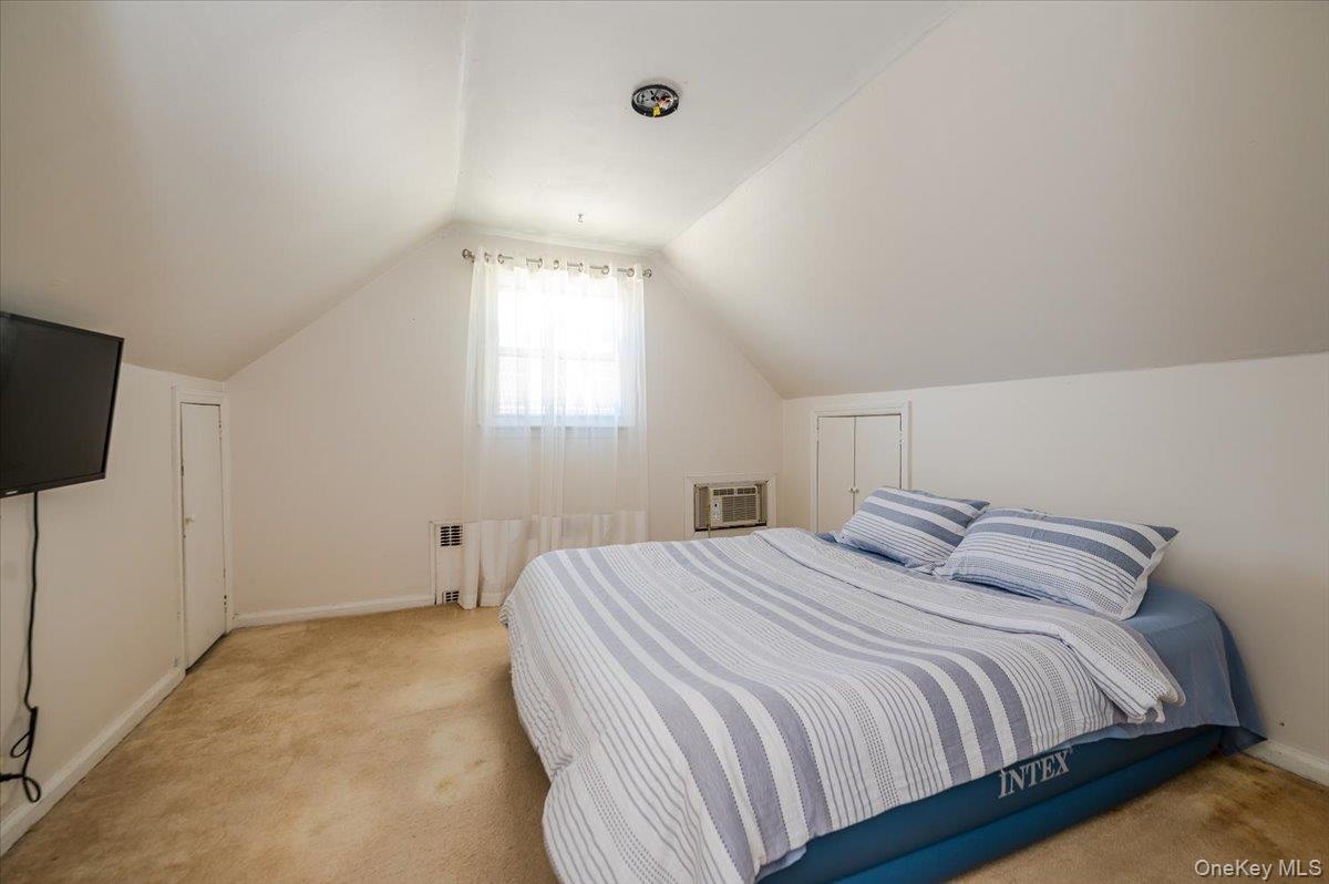 - Carpeted bedroom featuring lofted ceiling and a wall unit AC