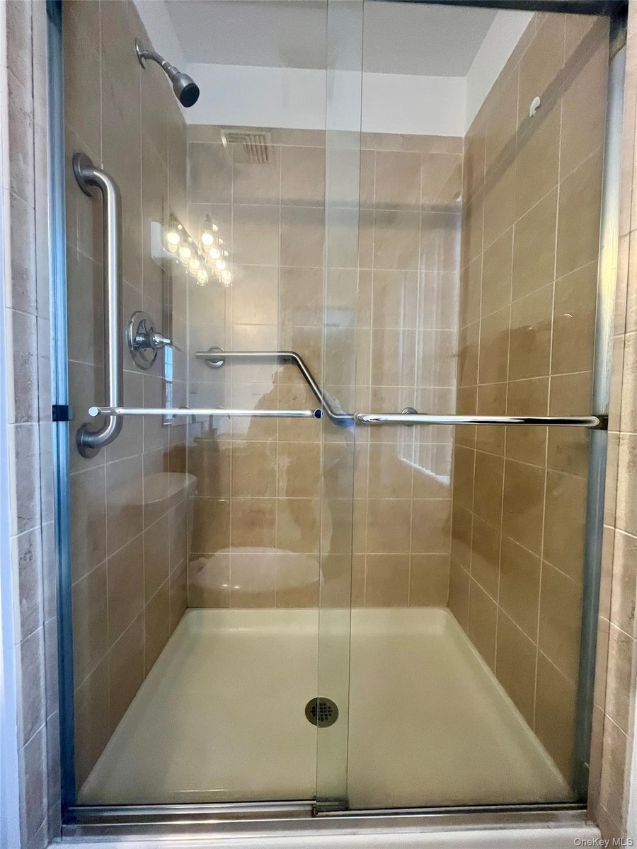 - Bathroom with vanity, a shower stall, and light tile patterned flooring