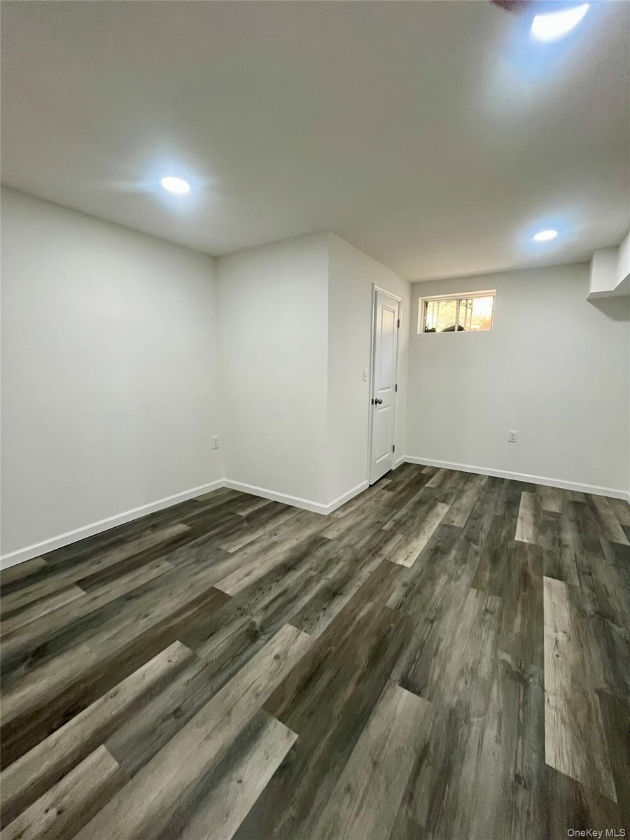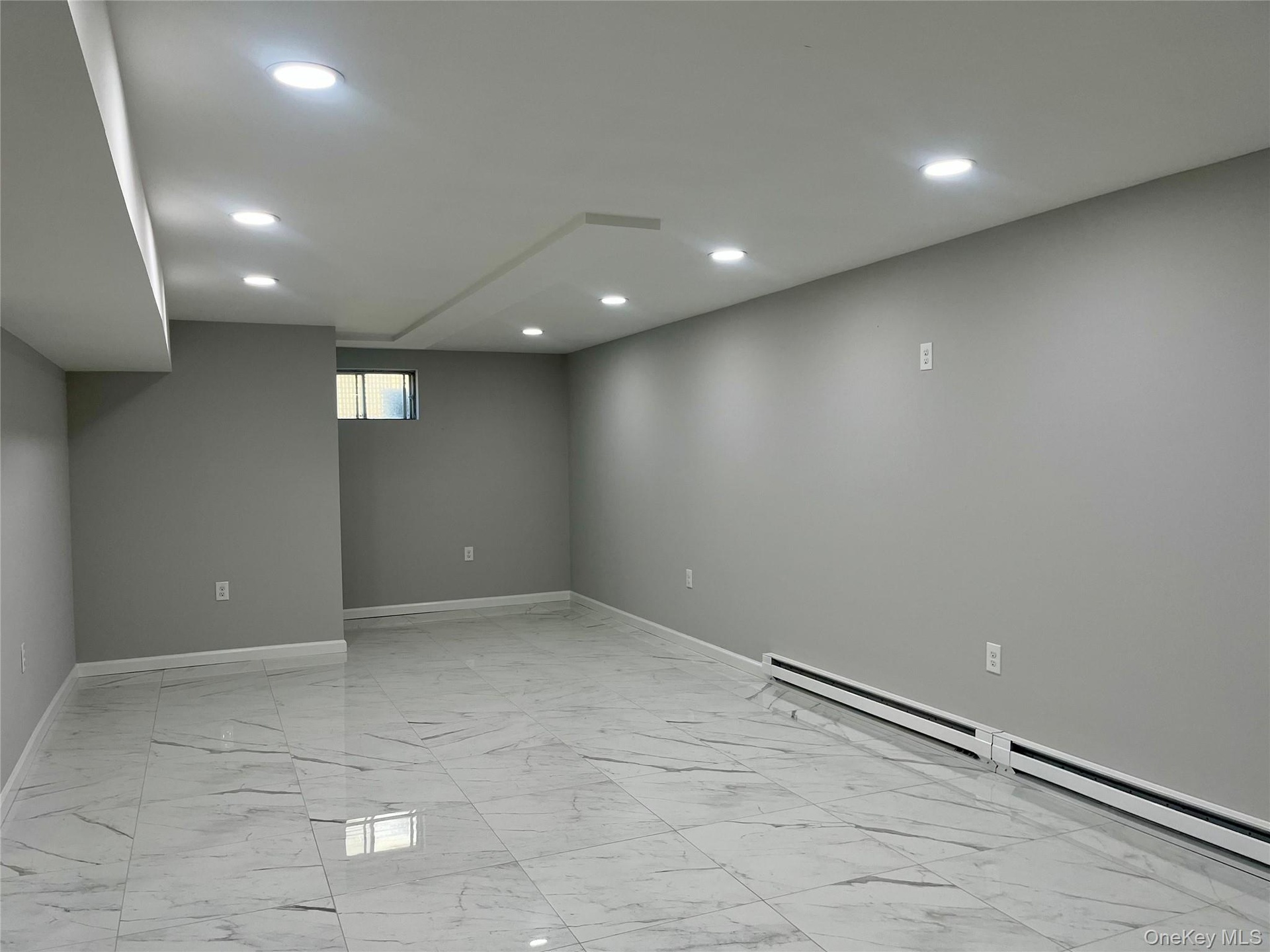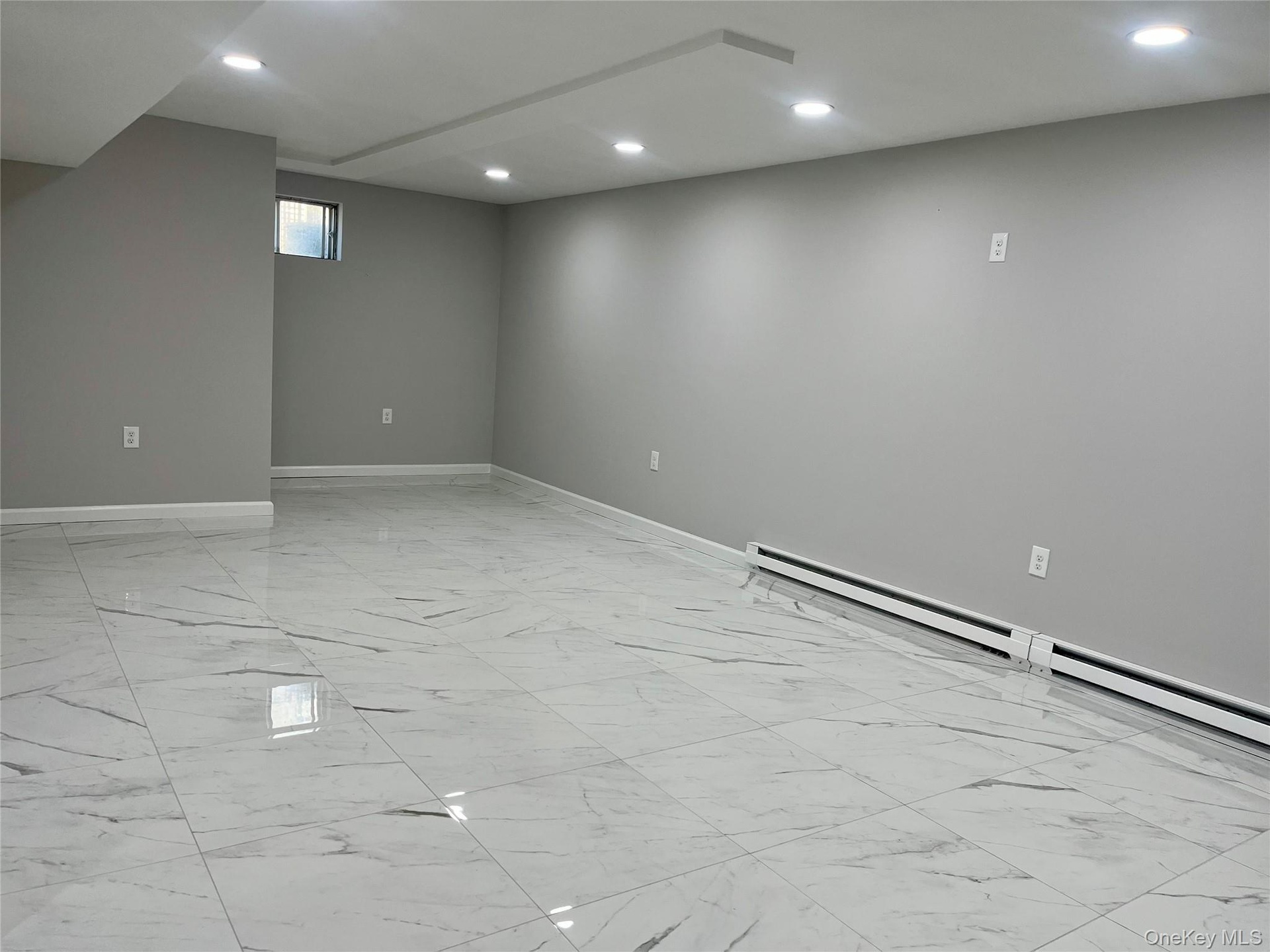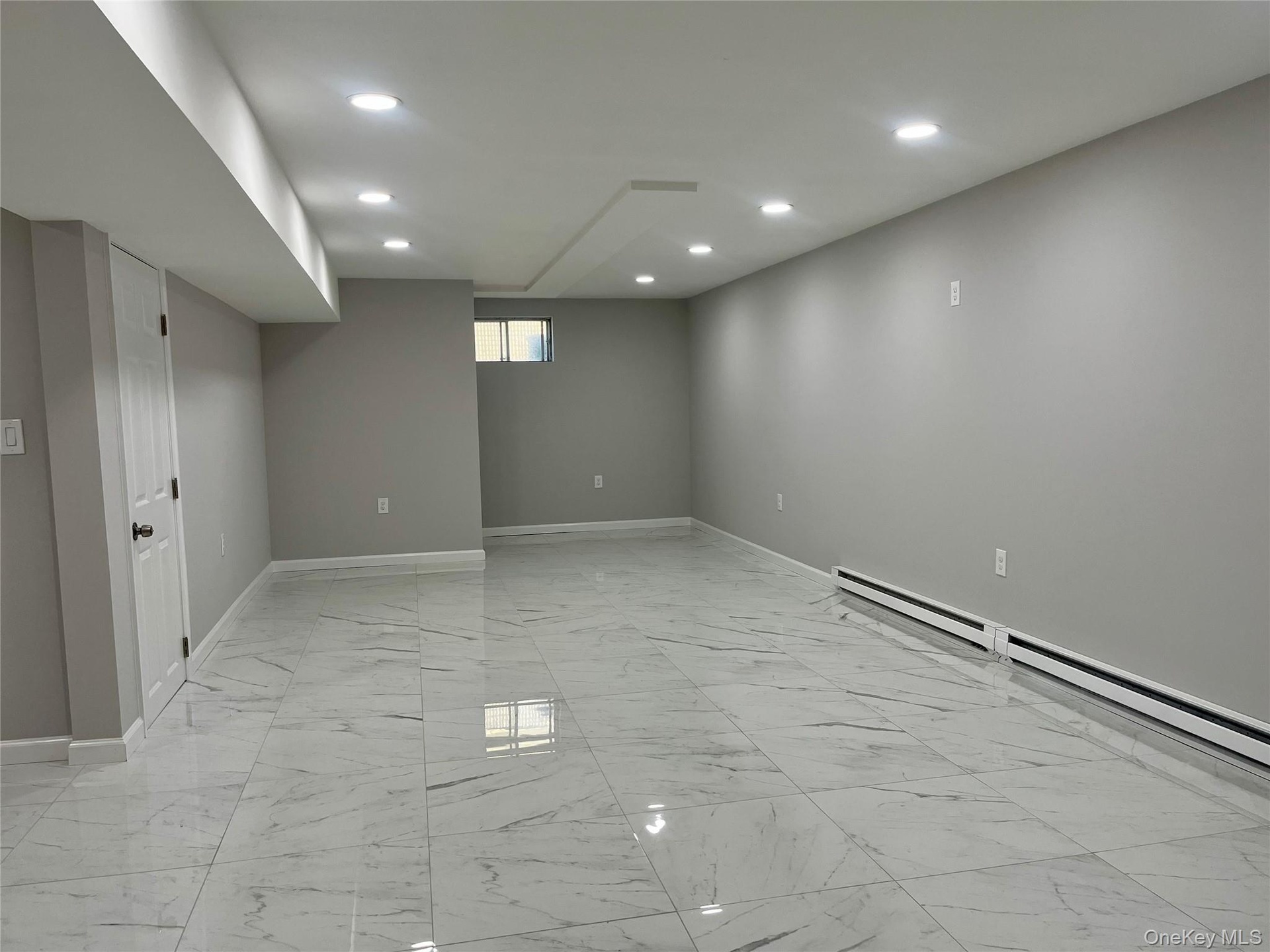 - Below grade area with light marble finish floors, recessed lighting, and baseboard heating