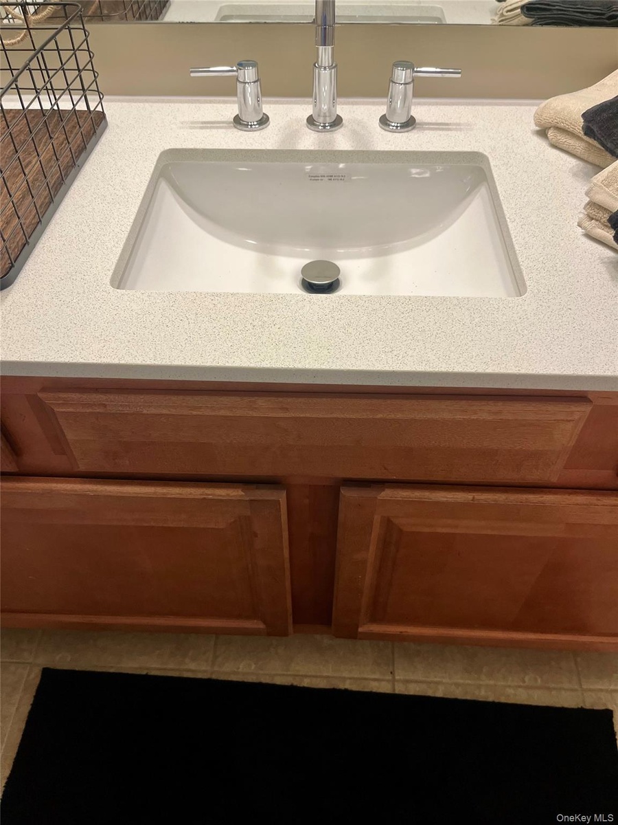 - Full bathroom featuring vanity, light tile patterned floors, and a shower with shower curtain