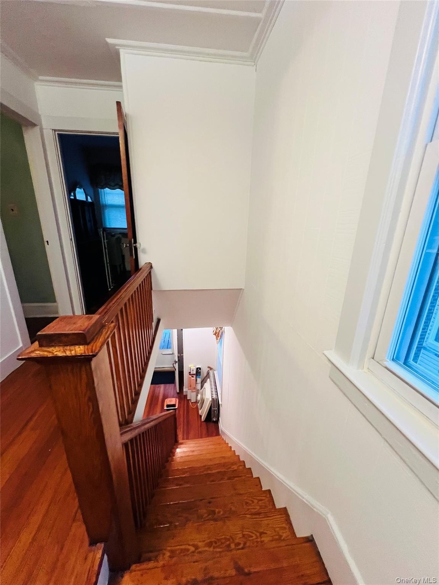 - Stairway with wood finished floors and crown molding