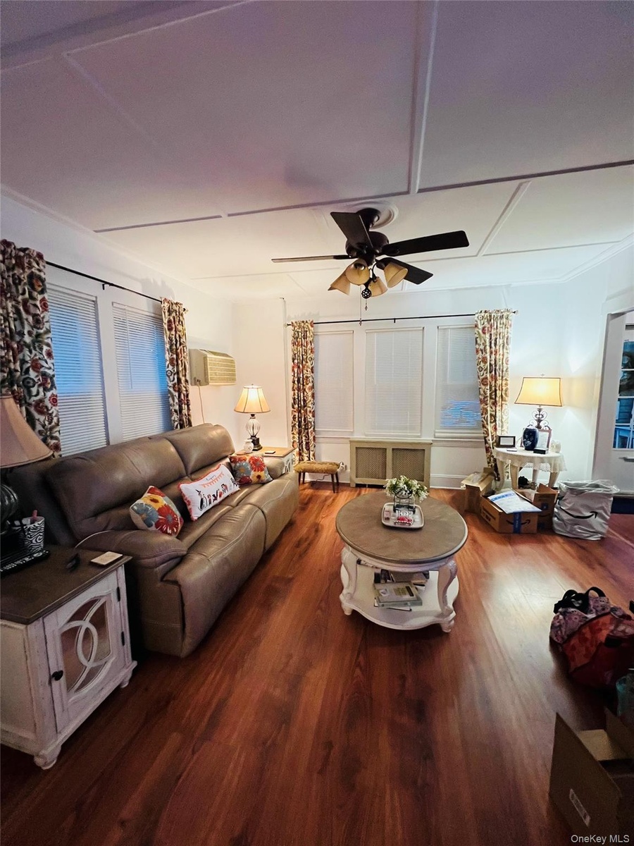 - Living area featuring wood finished floors, radiator heating unit, ceiling fan, and a wall mounted air conditioner
