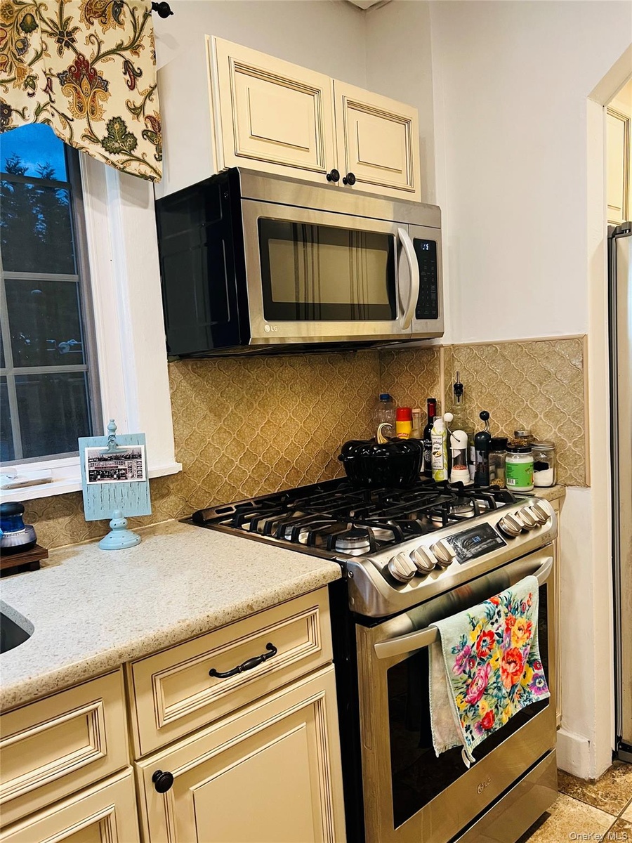 - Kitchen with cream cabinets, appliances with stainless steel finishes, decorative backsplash, and light stone counters