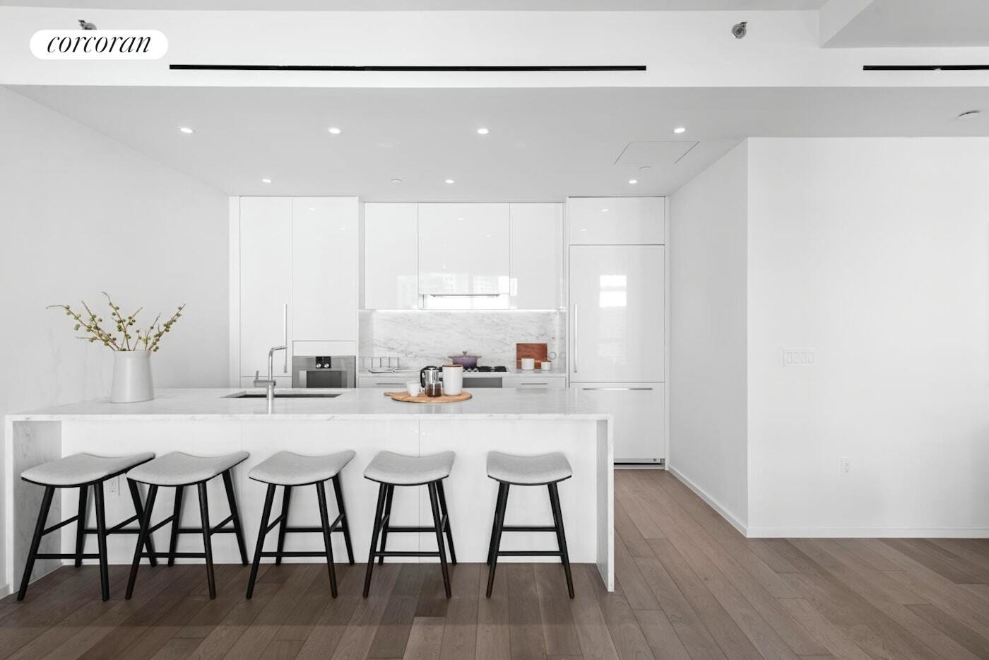 Designed for both entertaining and everyday living, the residence offers floor-to-ceiling windows, wide-plank oak flooring, and an open-concept living and dining area anchored by a chef's kitchen appointed with Gaggenau appliances and custom white lacquer cabinetry.
