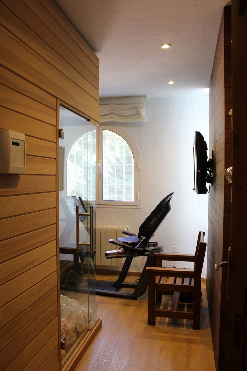 The outdoor area is a true private retreat. A beautifully landscaped garden surrounds the villa, with a private swimming pool, sunbathing area, and built-in barbecue ideal for alfresco dining. The south-facing orientation ensures sun throughout the day, while mature trees and a pergola provide shaded spots for relaxation.